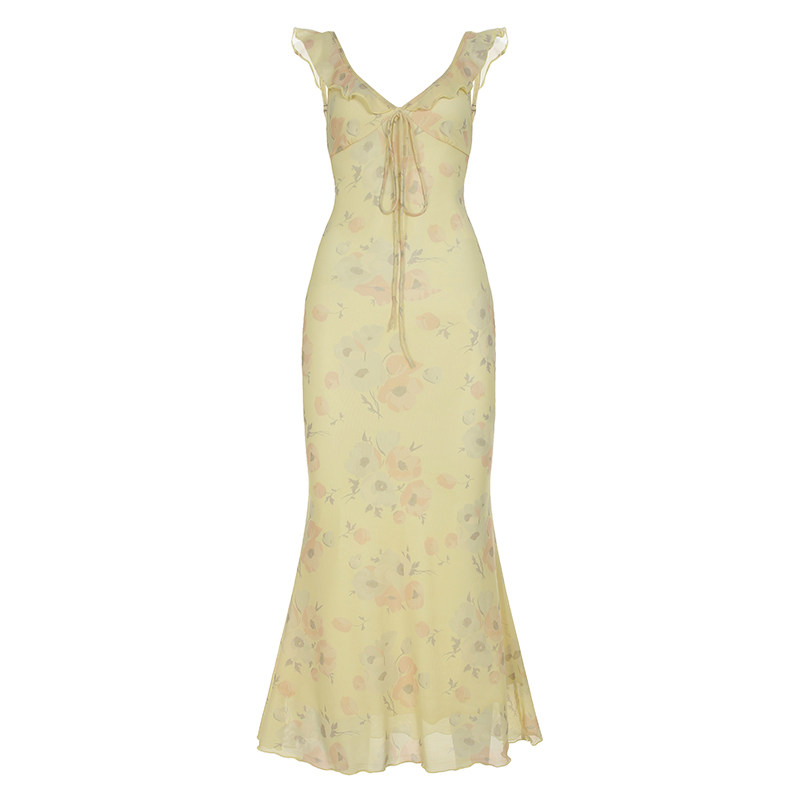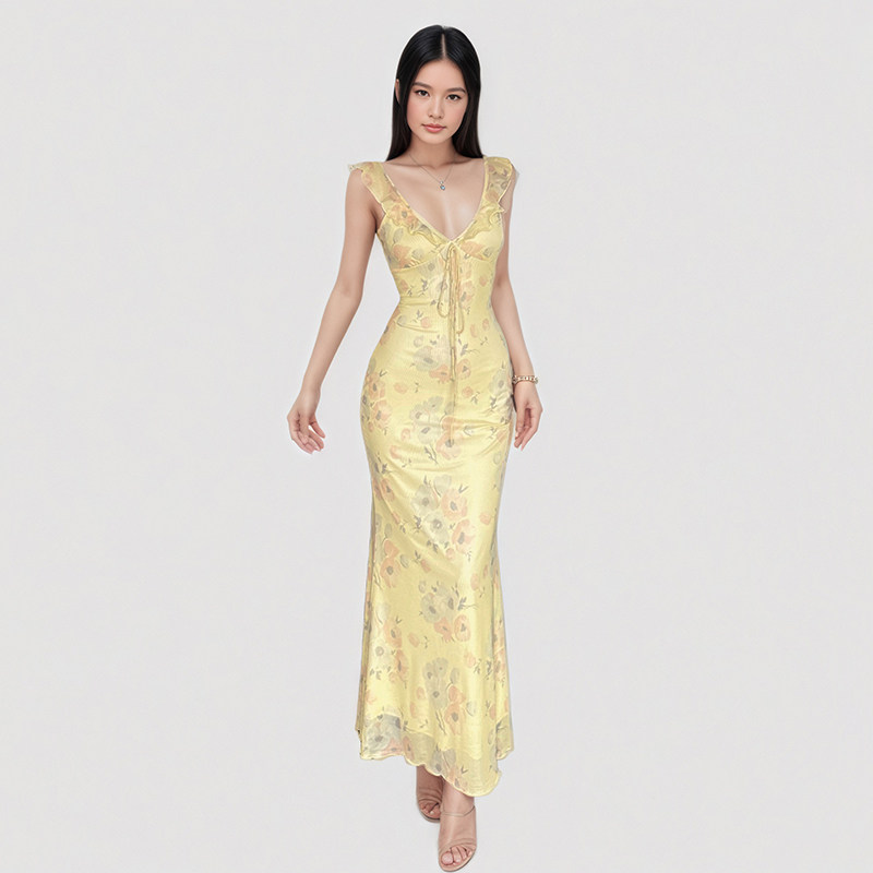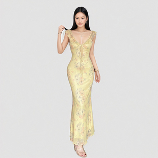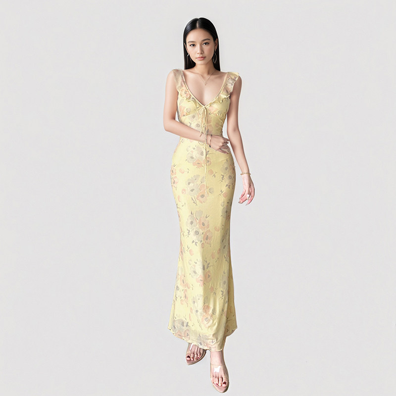 SylCue 御姐风性感荷叶边层次感低胸显瘦吊带连衣裙百搭不规则裙