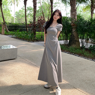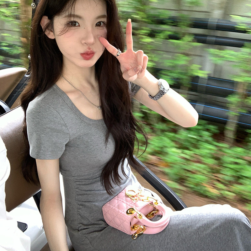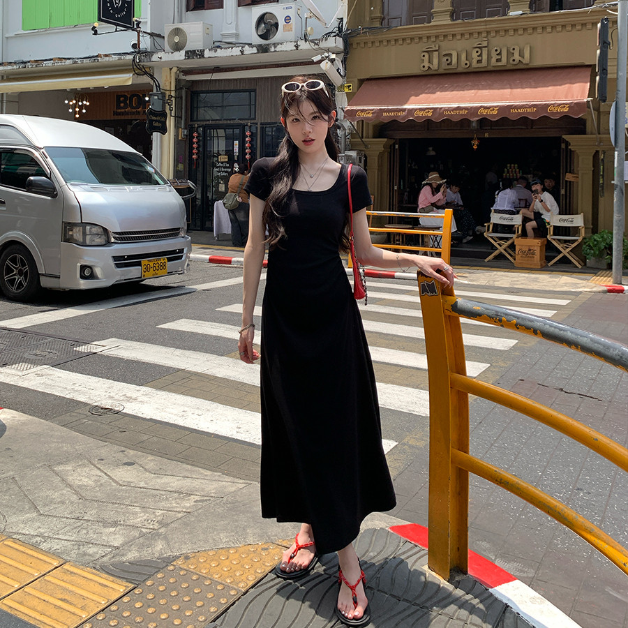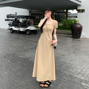 弹力u领修身 连衣裙掐腰裙女夏季 显瘦纯色长裙子 stevens短袖 alex