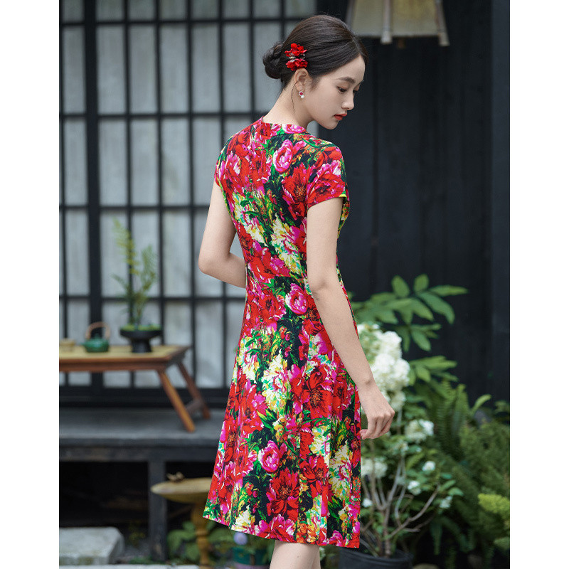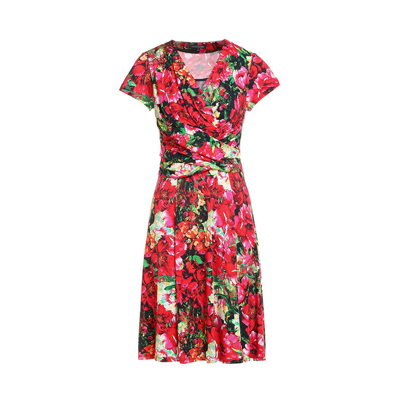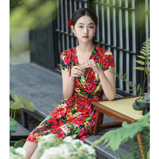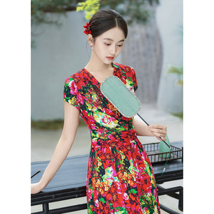 A字裙中长款 沐兰法式 轻奢修身 新款 气质牡丹印花V领连衣裙2025夏装