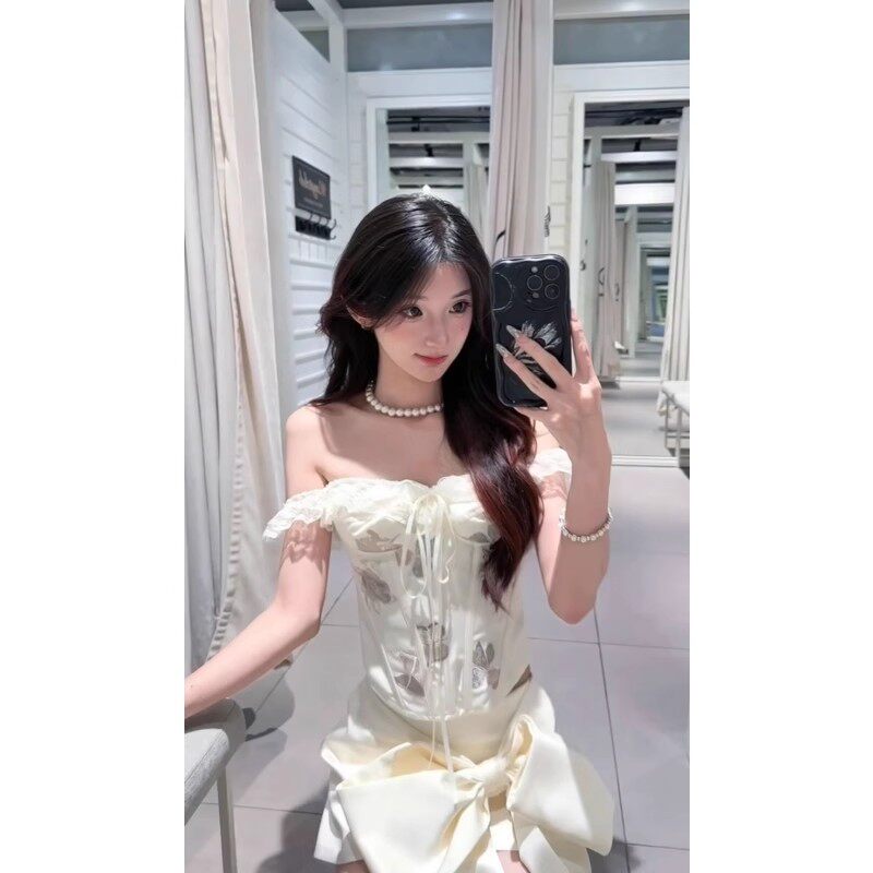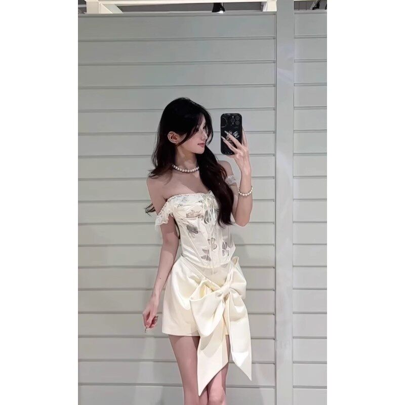 法式 上衣别致蝴蝶结短裙两件套 纯欲高级感精致一字肩拼接花边修身