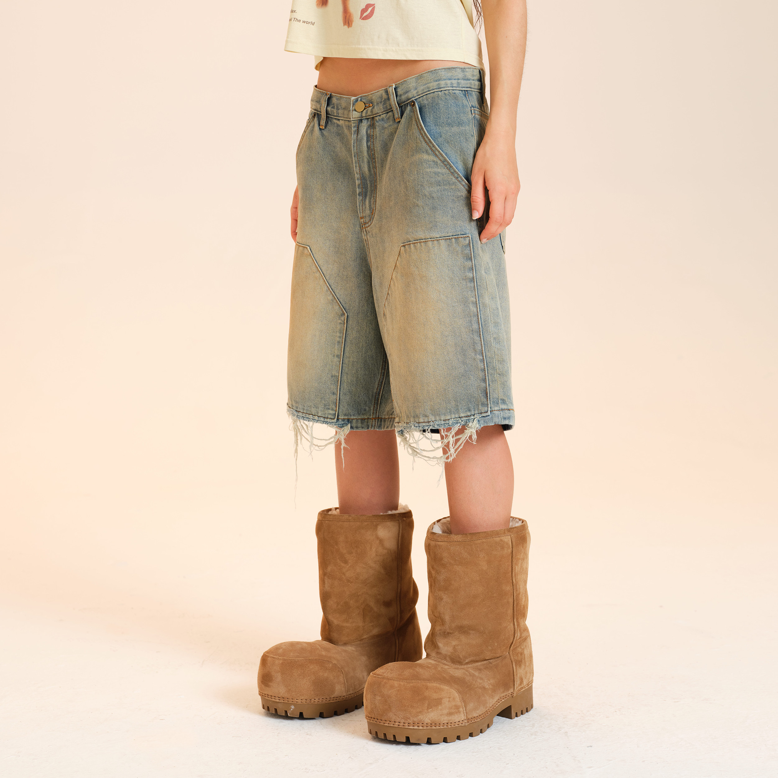 Cozydoll慵懒复古多种酵素洗重工做旧破坏显瘦双膝牛仔中裤 五分裤