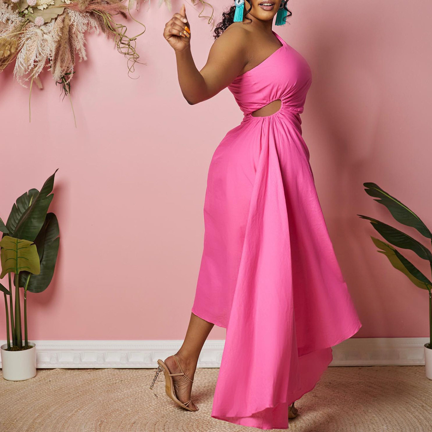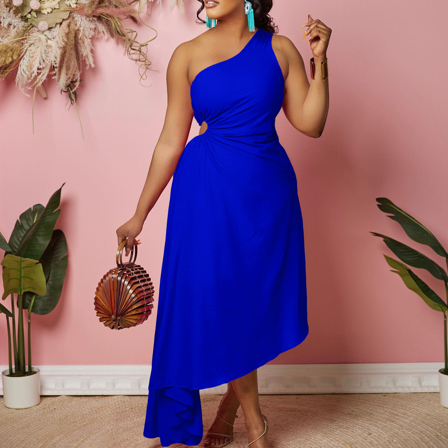 Out Oblique Shoulder Solid 修身 Cut Dress 镂空斜肩连衣裙 Slim