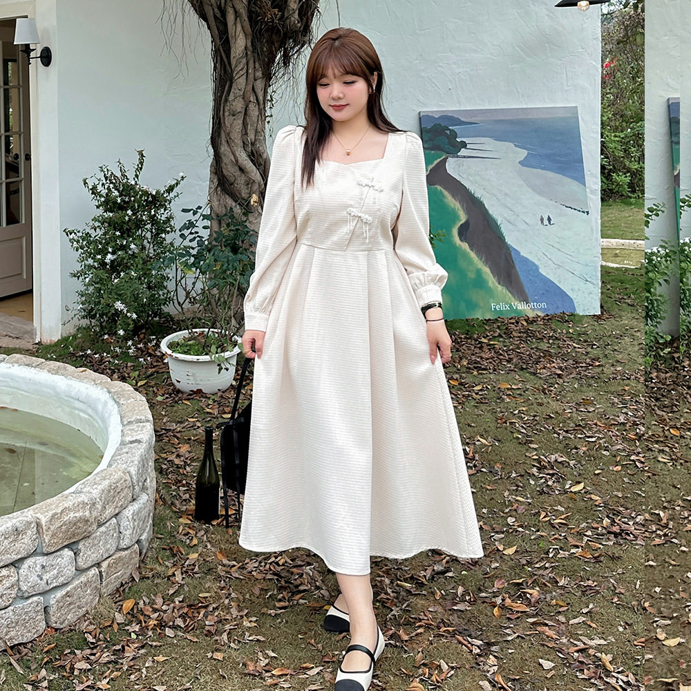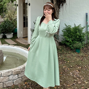 长裙子 半开襟收腰长袖 胖mm秋冬显瘦针织连衣裙木子理想大码 女装