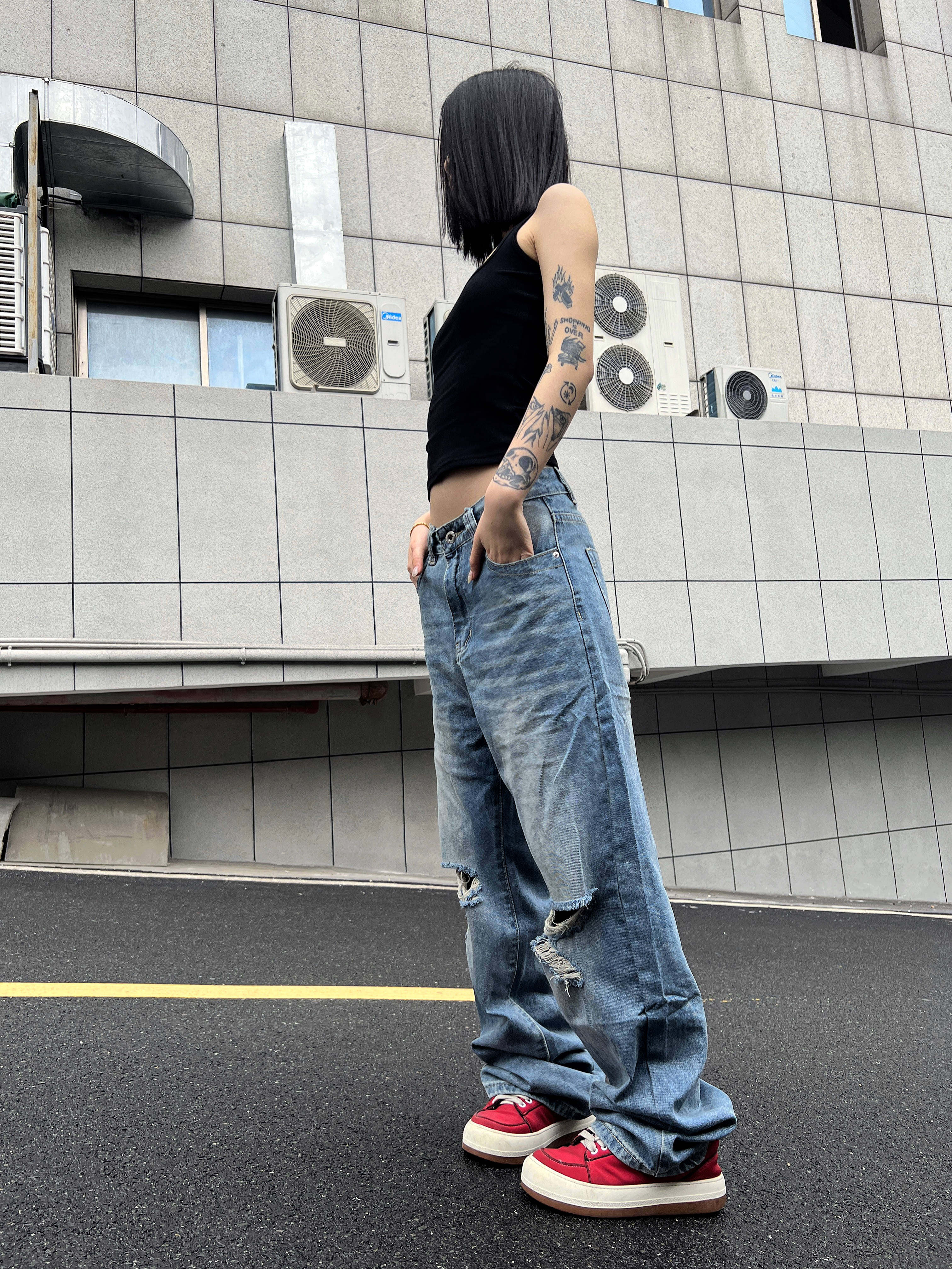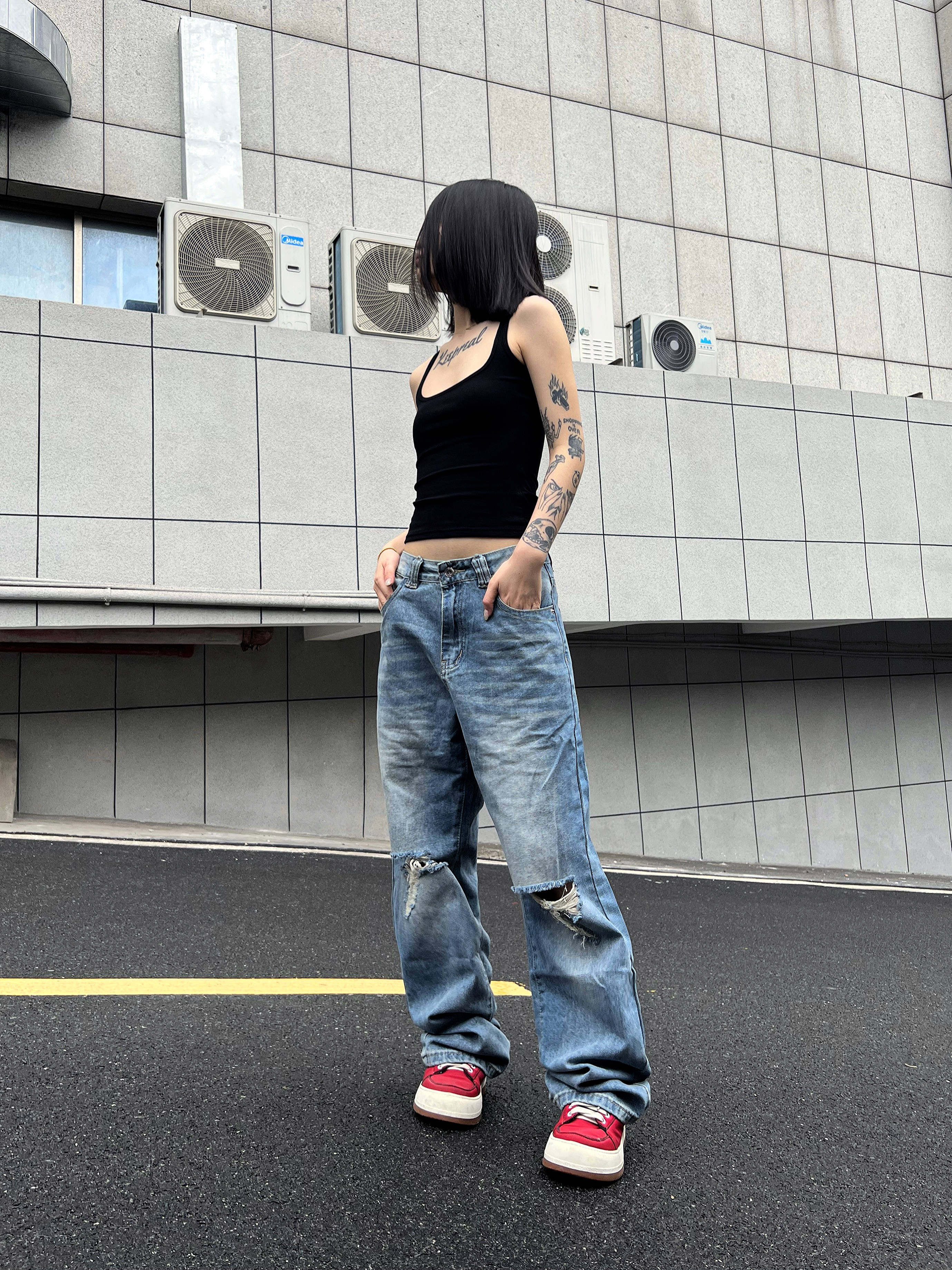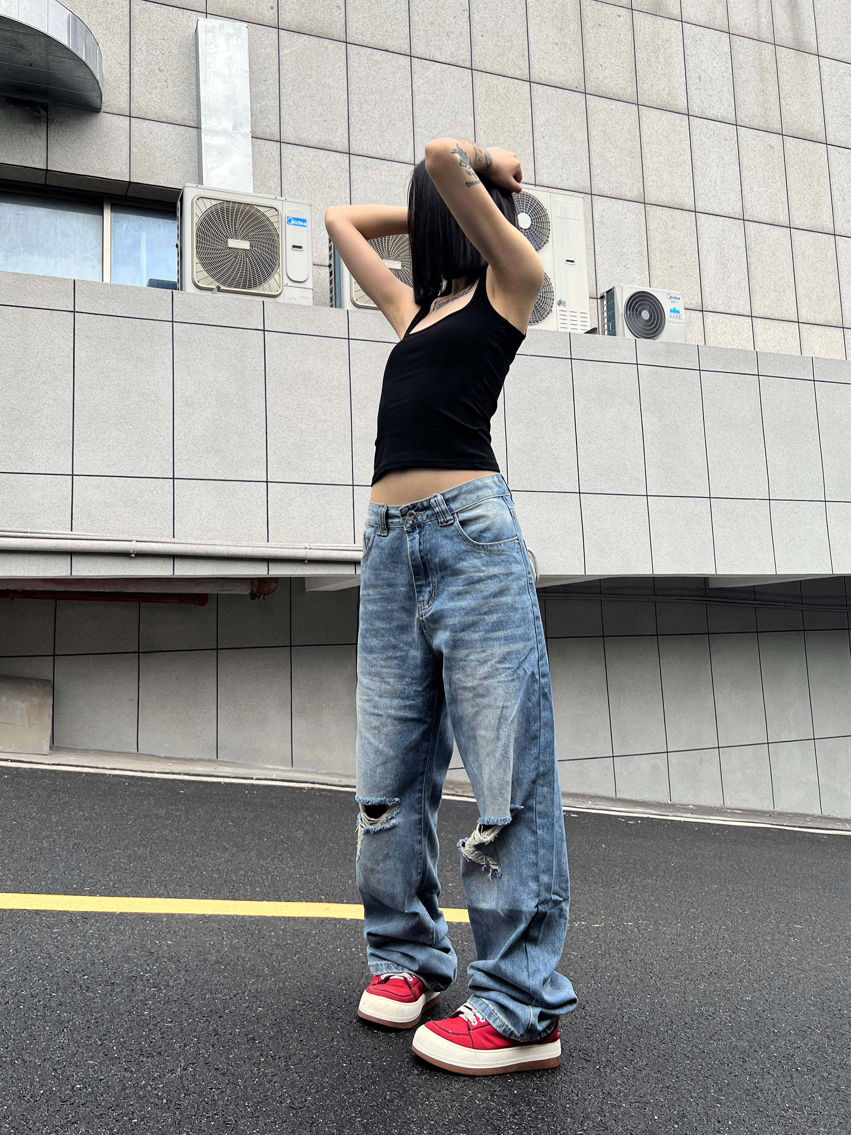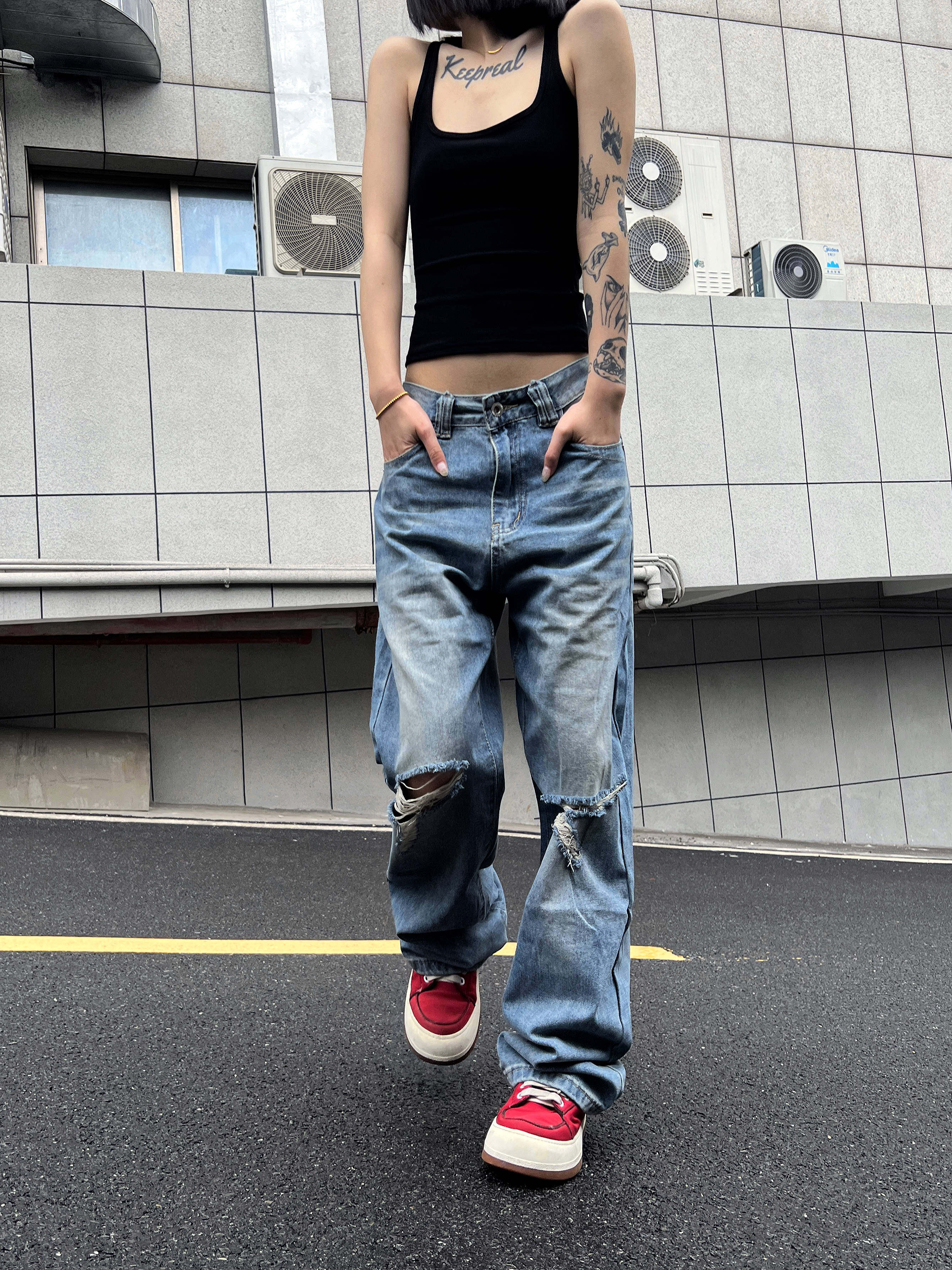 2024AW国潮原创美式 显瘦裤 水洗浅色破洞牛仔裤 薄款 男女夏季 F383