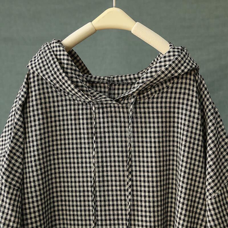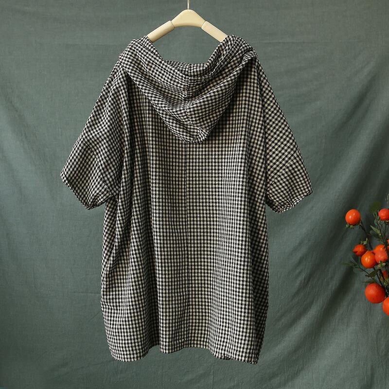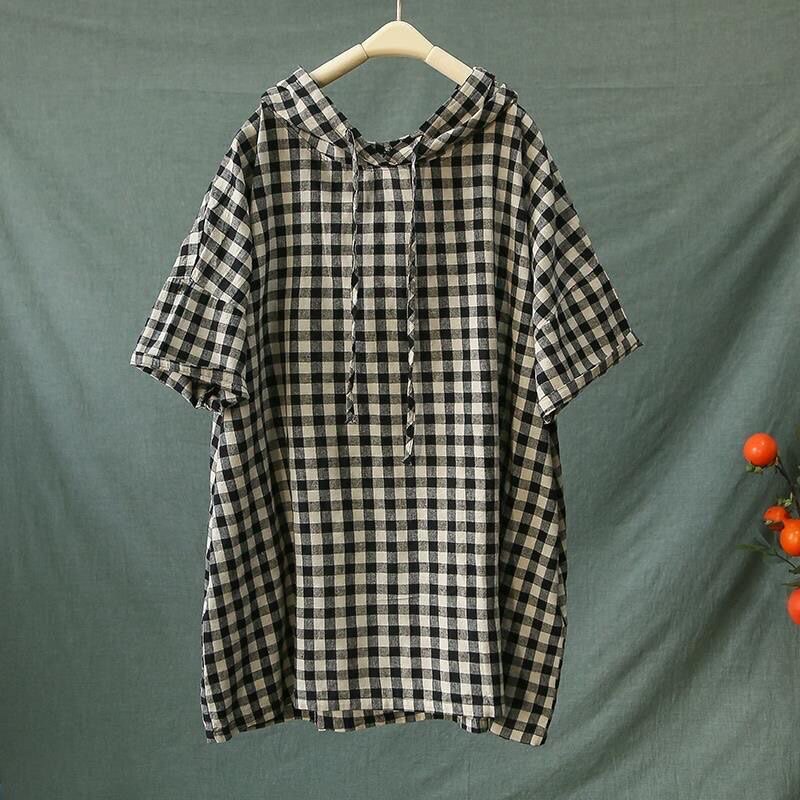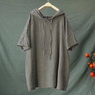 棉麻格子文艺复古带帽t恤衫 上衣 女加肥加大宽松遮肉百搭潮流短袖