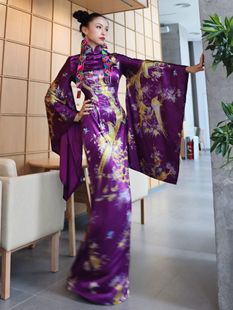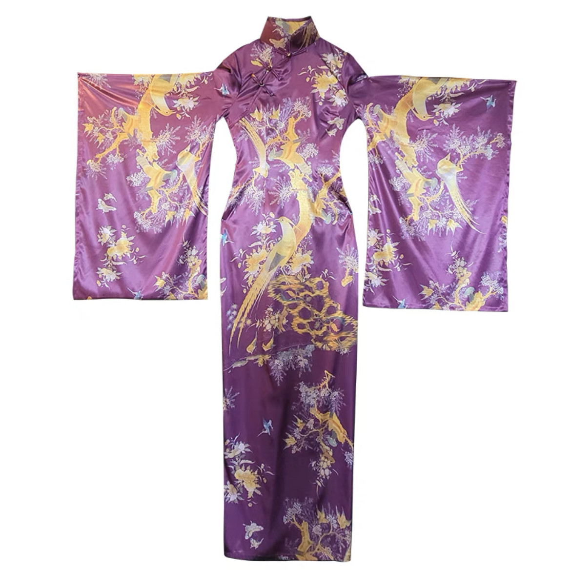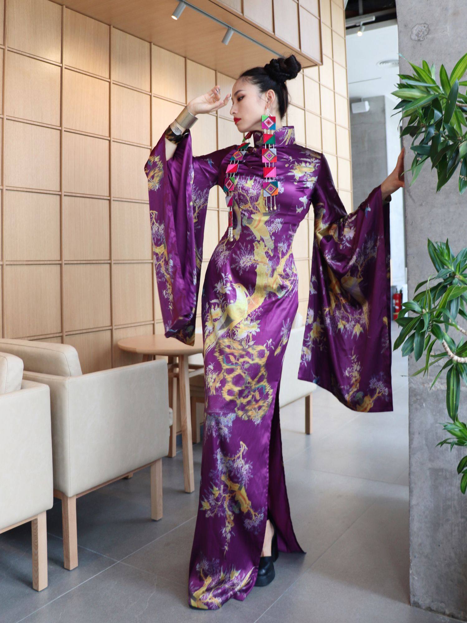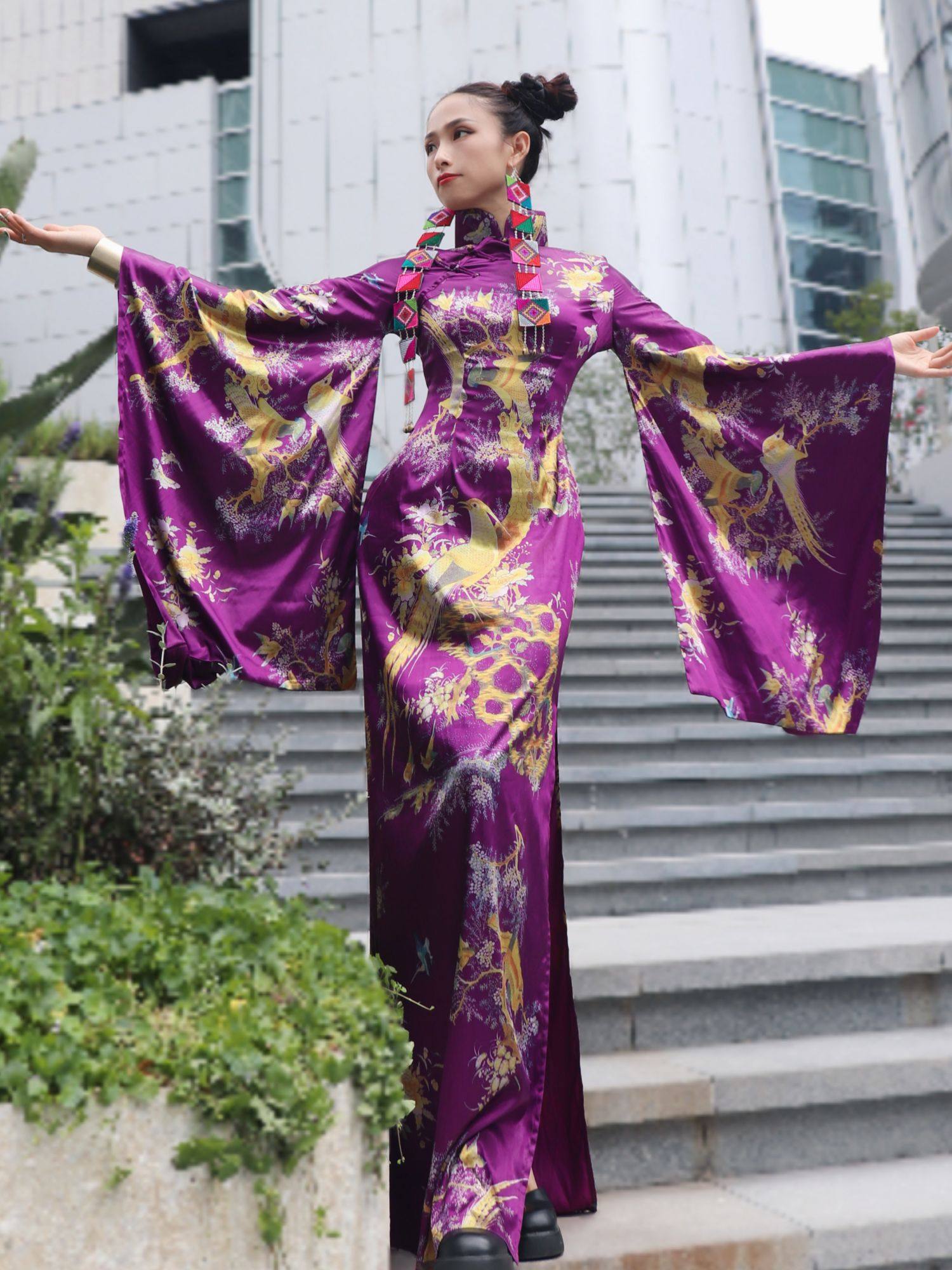 锦秀儿原创定制紫色缎面连衣裙花鸟方形长水袖 走秀改良旗袍 新中式