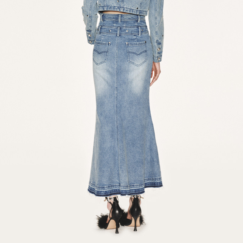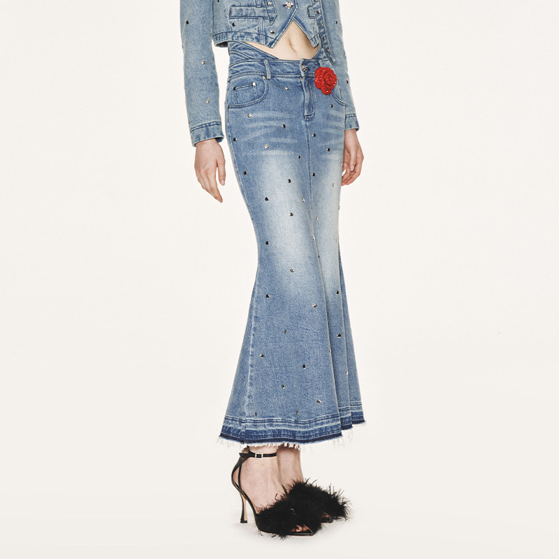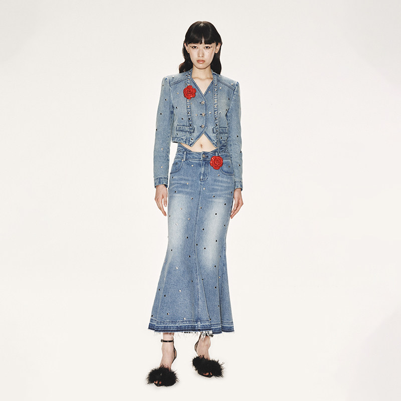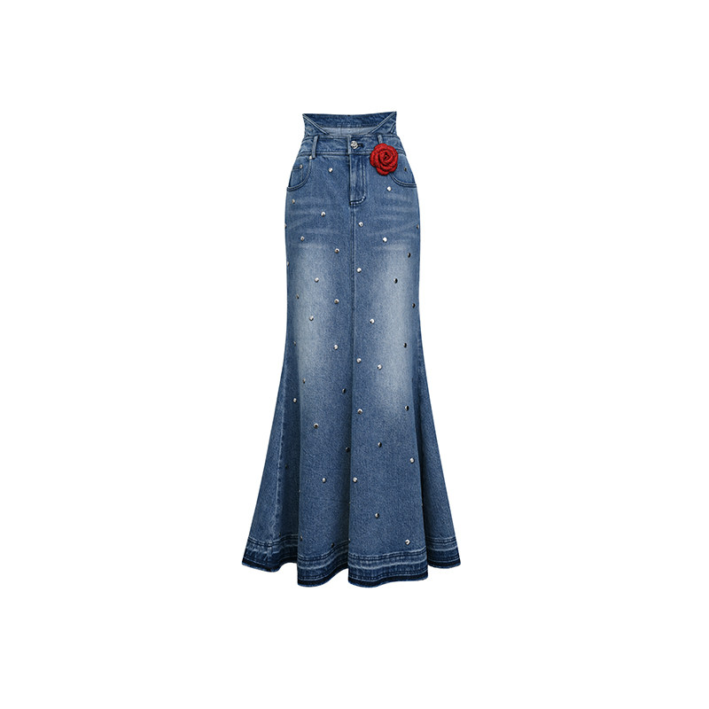 饰铆钉牛仔鱼尾半裙 lefame拉飞姆红色玫瑰花装 明星同款