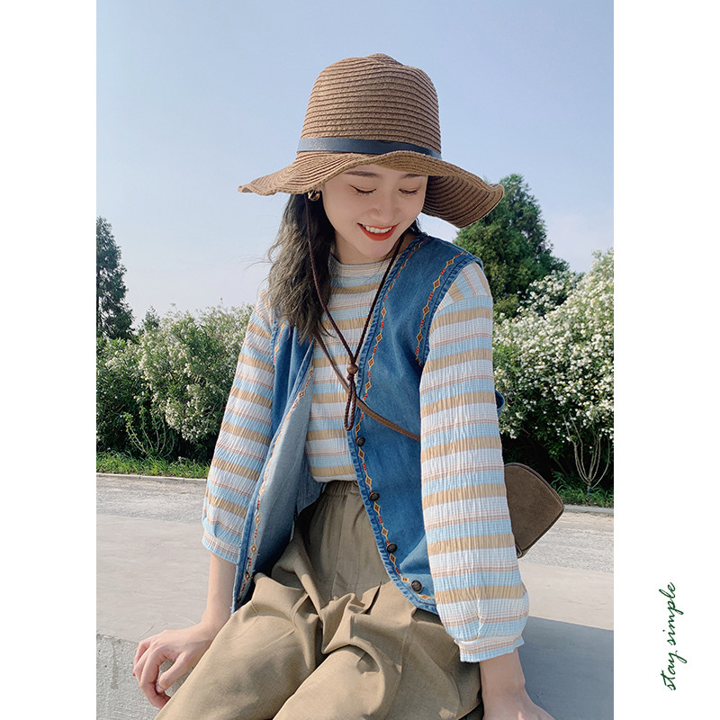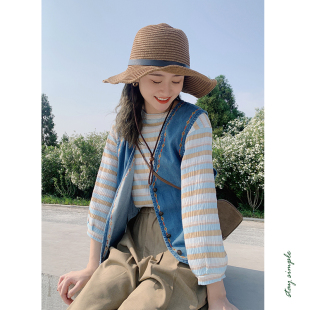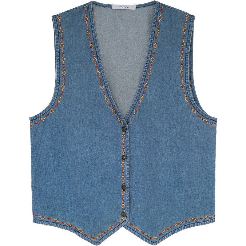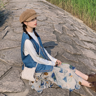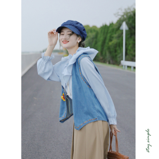马夹 秋无袖 花吉B493蓝色复古刺绣大V领开衫 牛仔马甲女2026新款