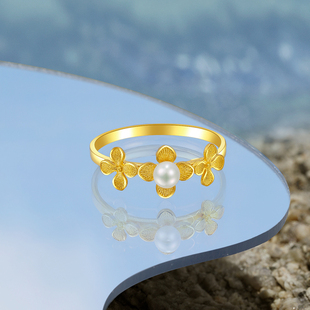 周六福黄金珍珠戒指女款 5d硬金玫瑰花弹力绳女戒黄金镶嵌官方礼物
