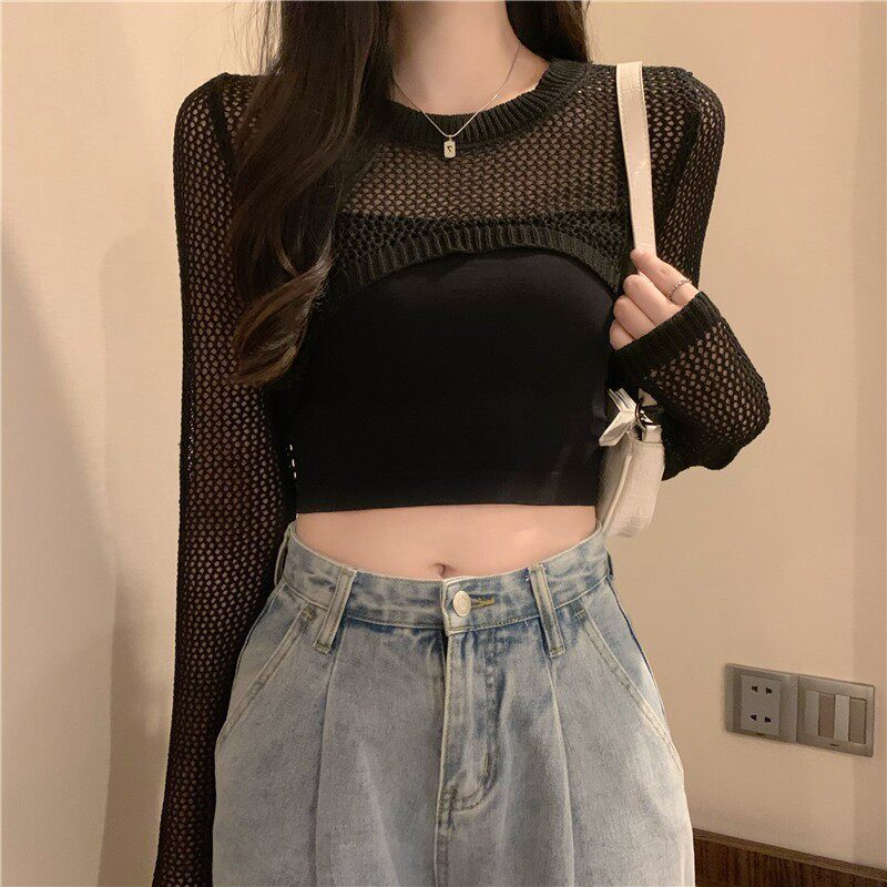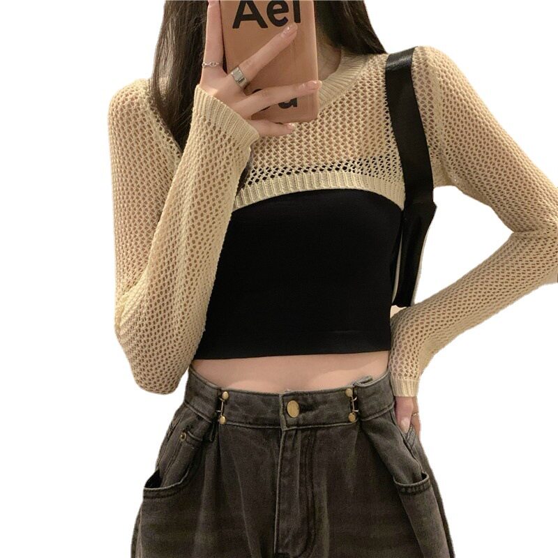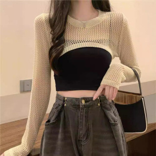 防晒针织外搭叠穿辣妹披肩 罩衫 潮流圆领镂空短款 长袖
