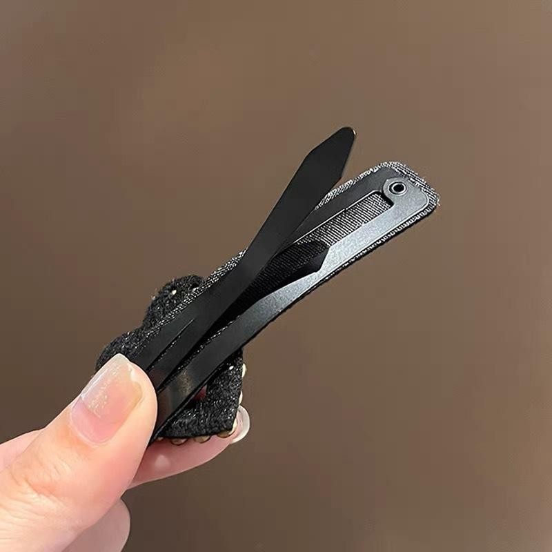 低丸子头黑色缎面蝴蝶结发夹女夏后脑勺弹簧夹后脑勺马尾夹子头饰