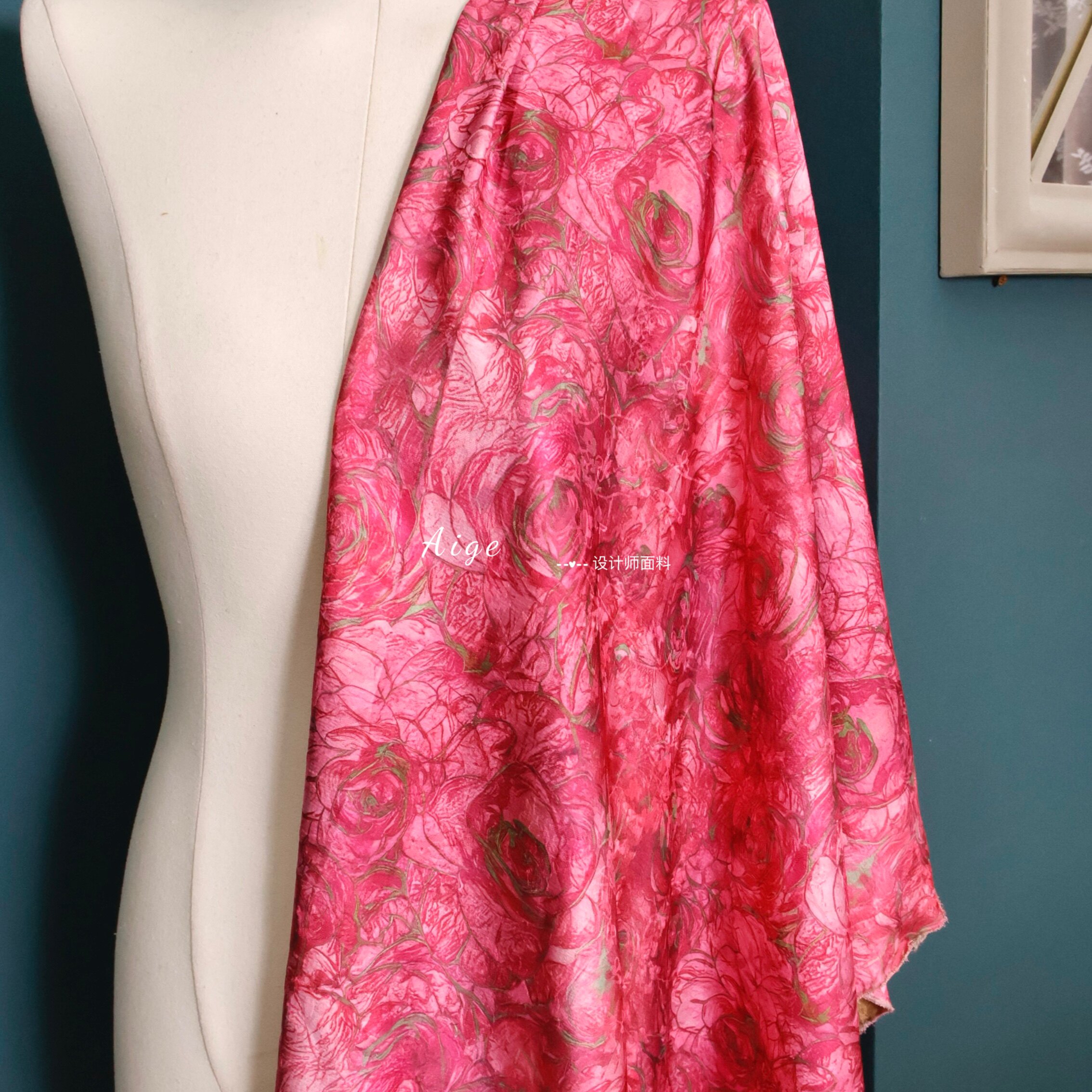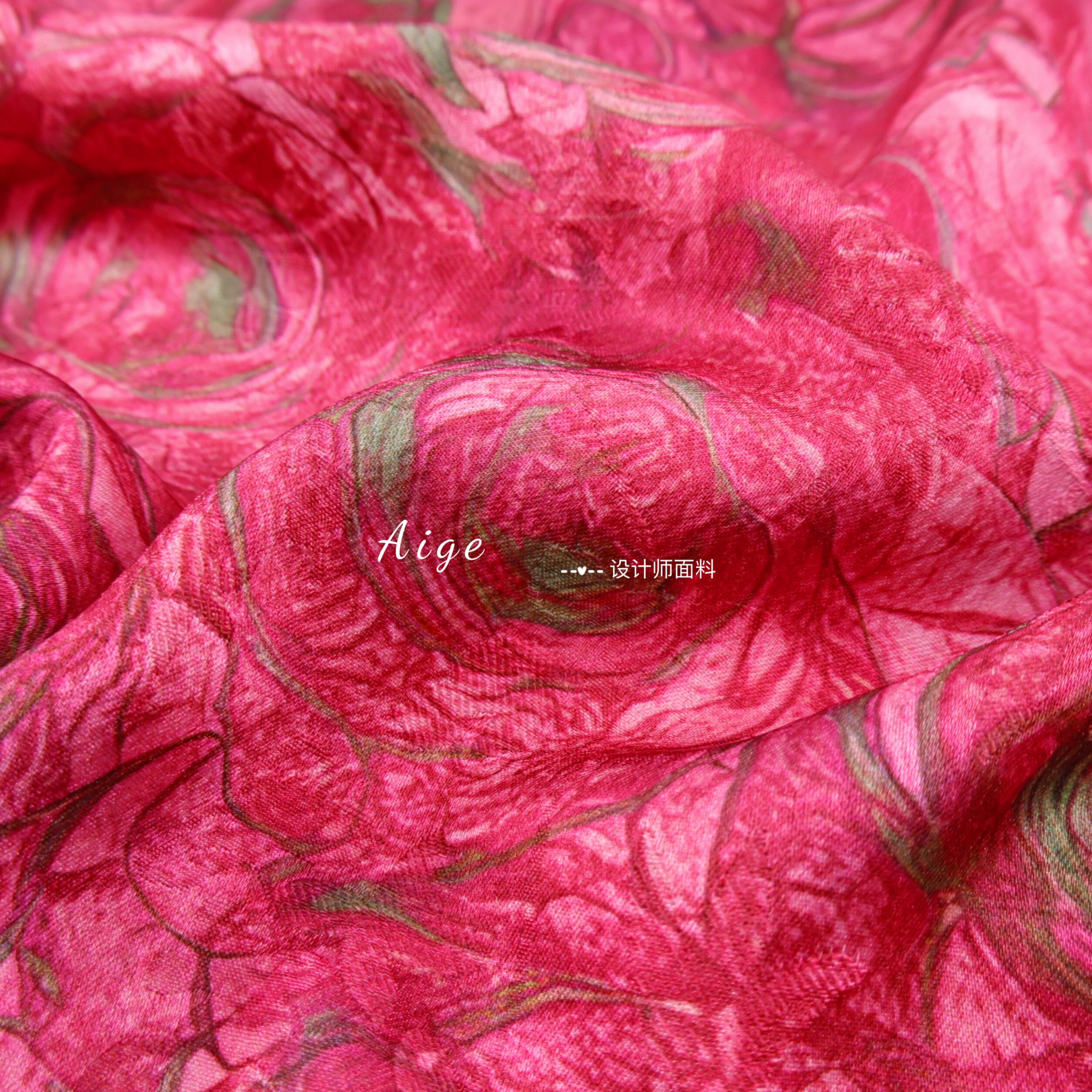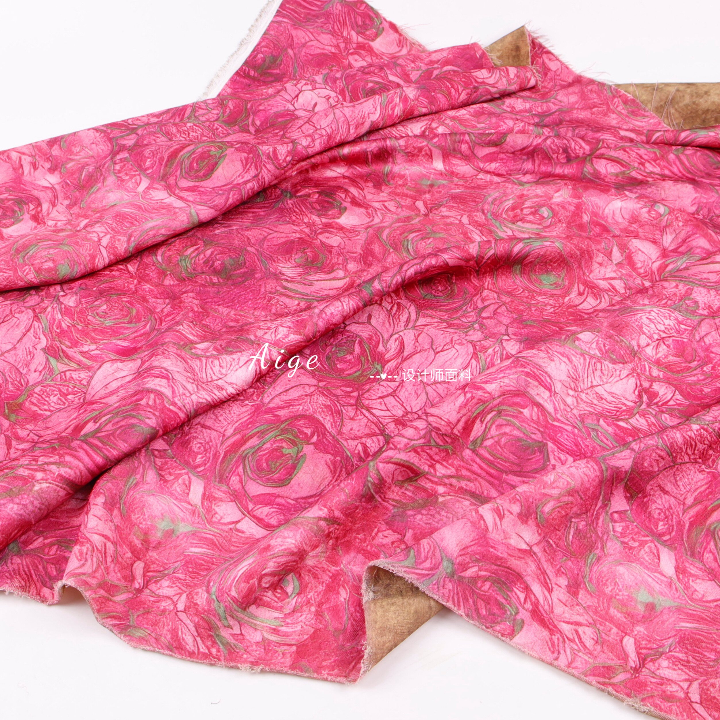 垂感亲肤 暗纹提花面料旗袍连衣裙布料 玫红色油画玫瑰花朵印花