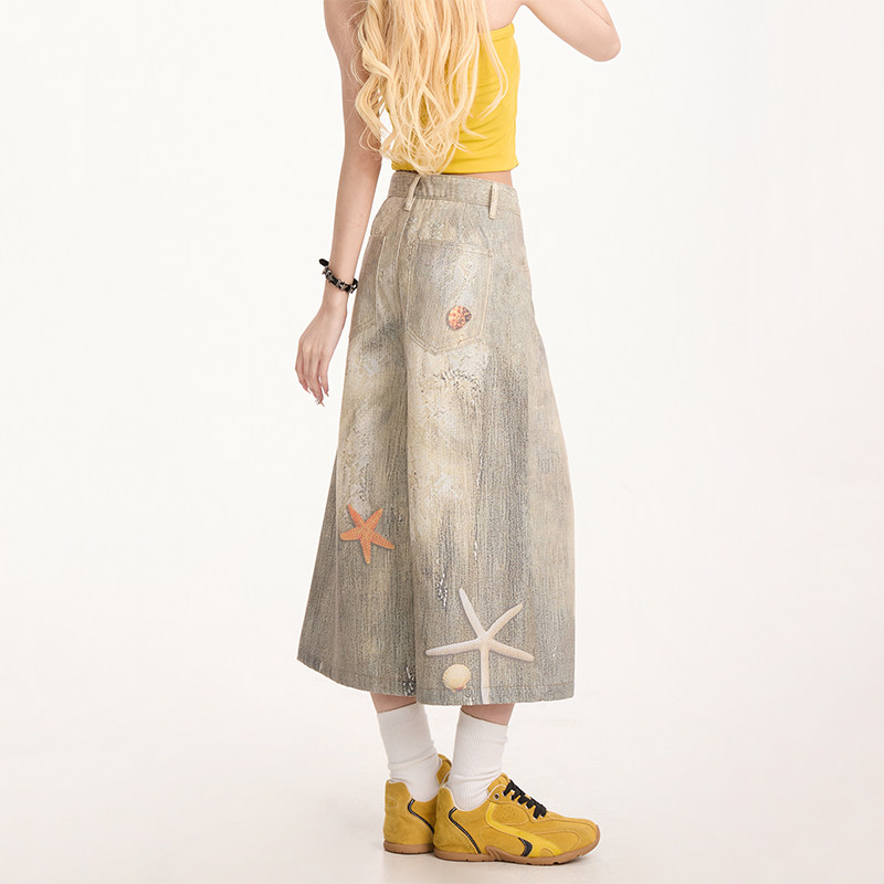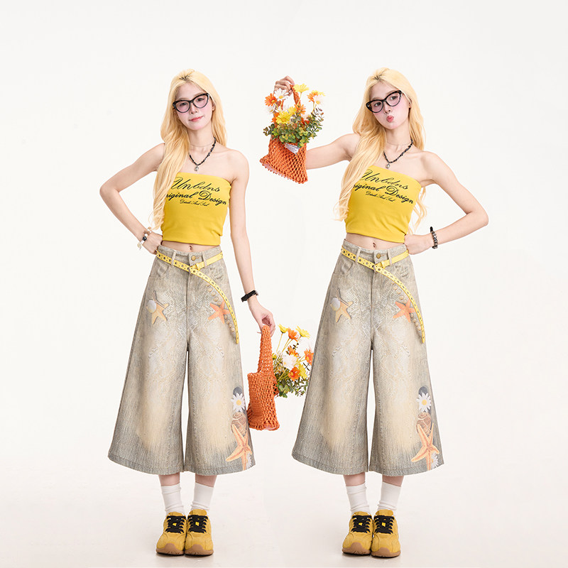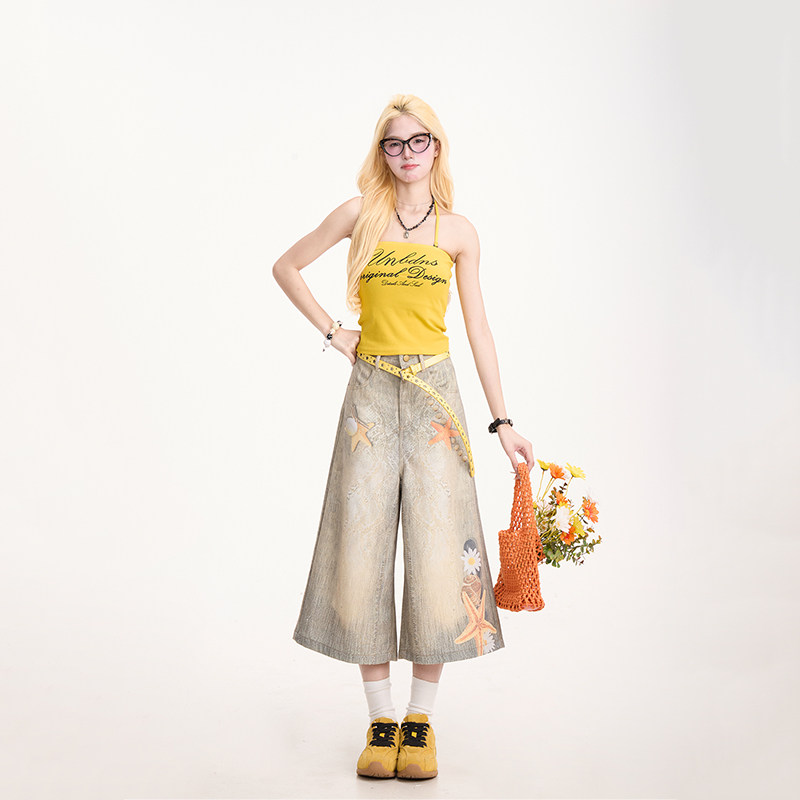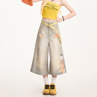 街头小众直筒阔腿短裤 女夏季 渐变海星印花七分牛仔裤 NERESUM美式