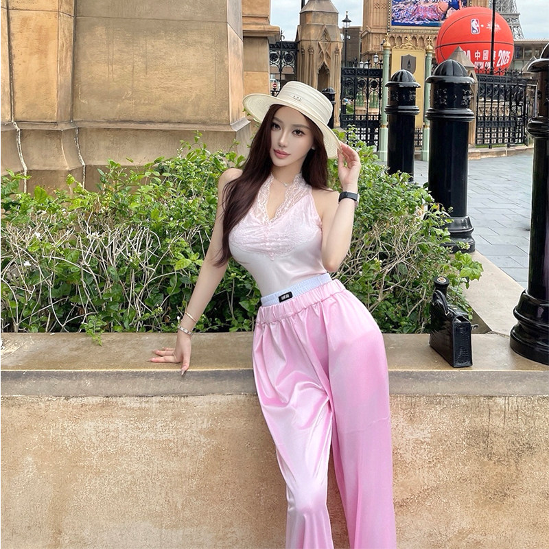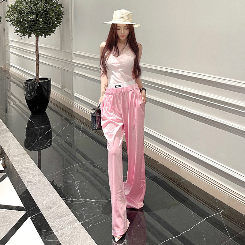 MIMIWU粉色双腰头缎面休闲裤 女松紧腰显瘦百搭垂感气质宽松直筒裤