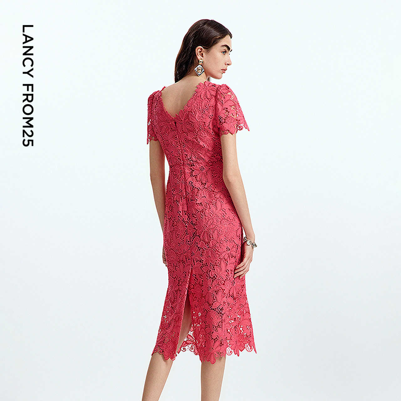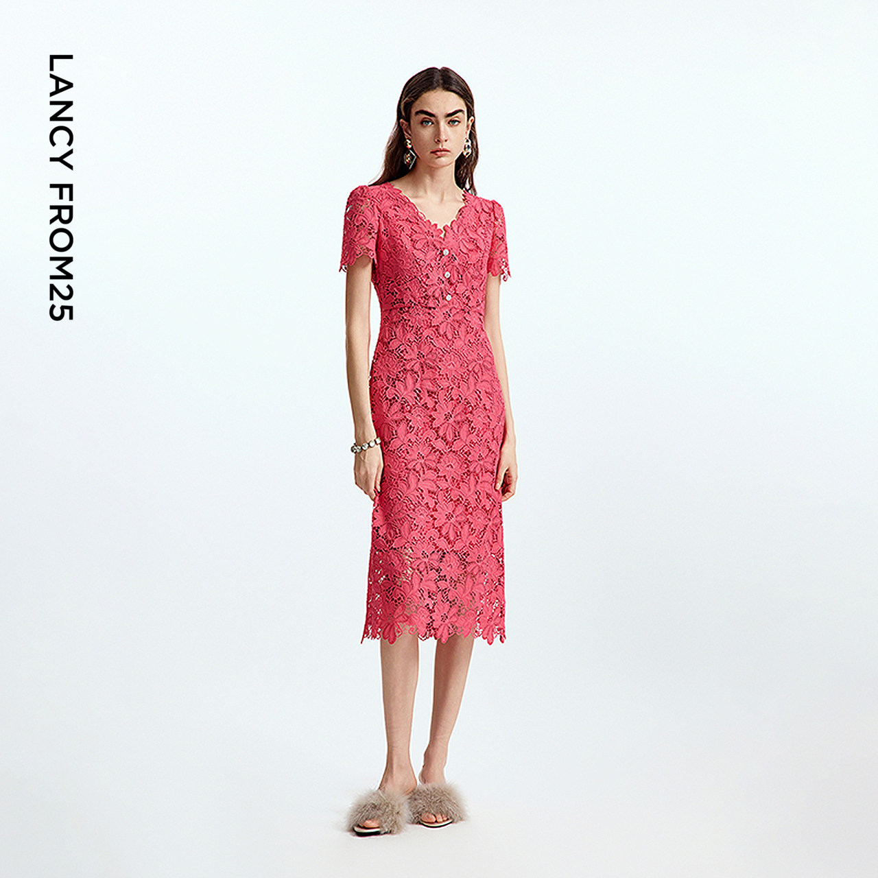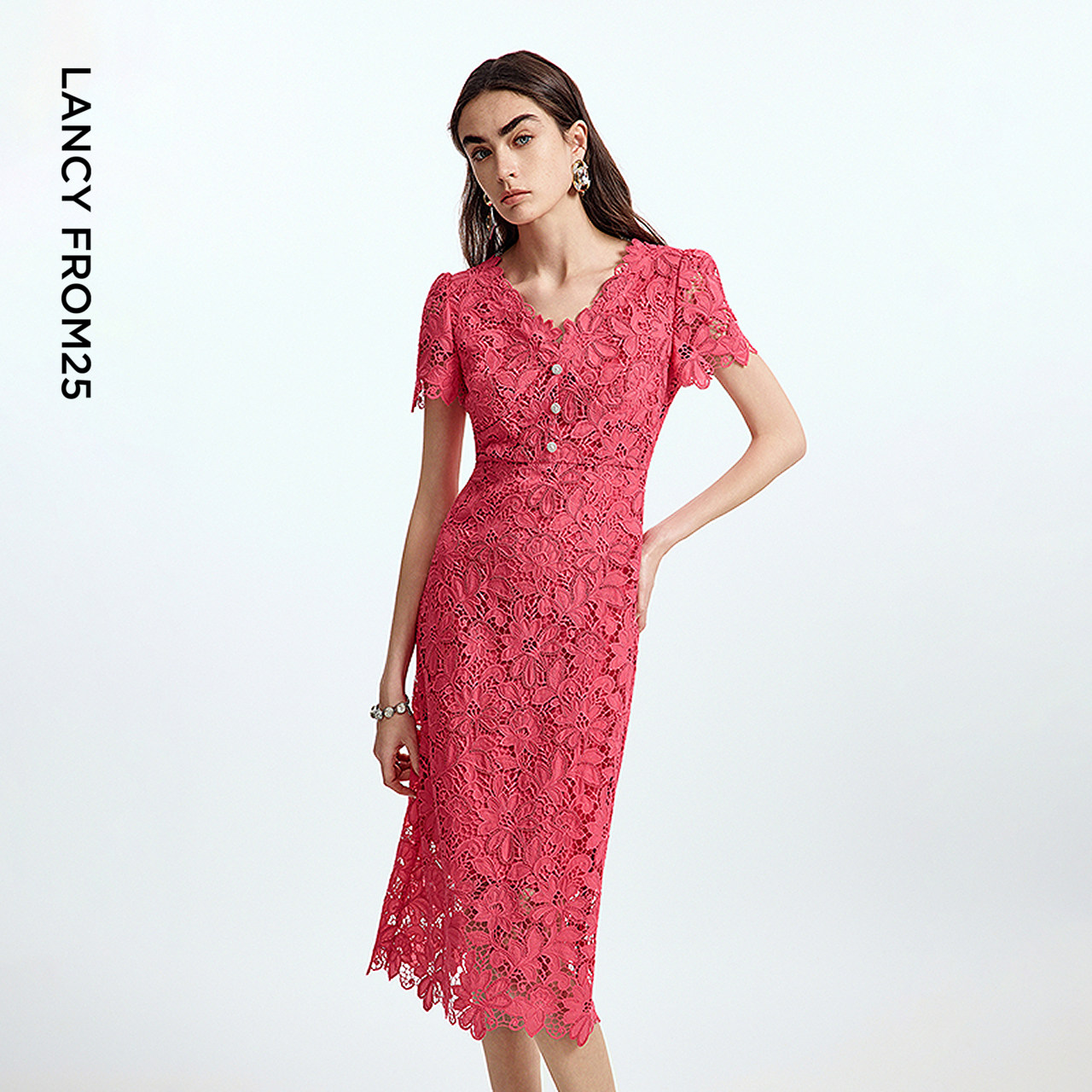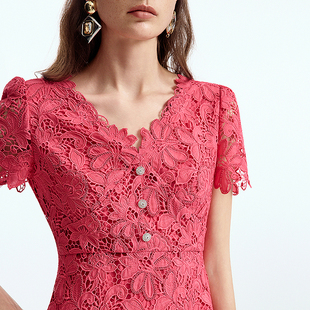 连衣裙 新款 朗姿V领气质修身 蕾丝收腰镂空高级感轻礼服2025年秋季