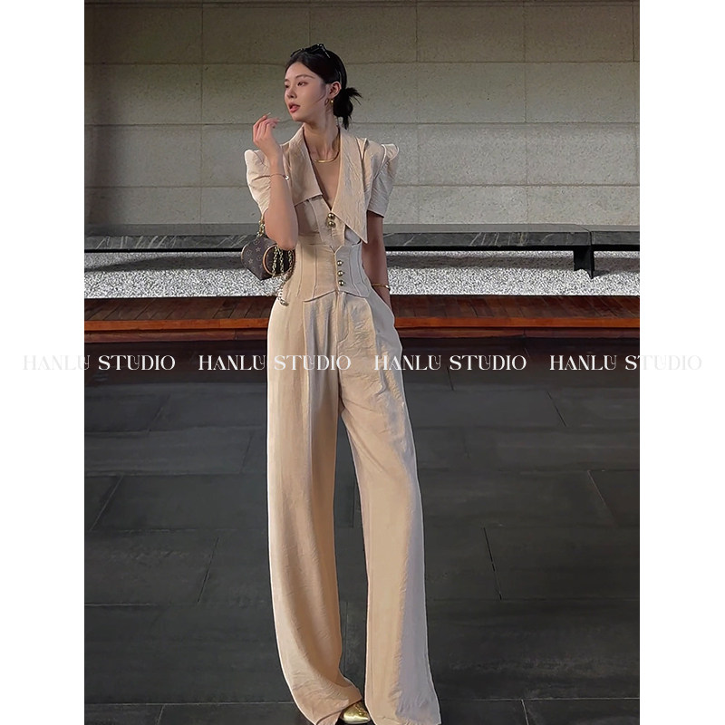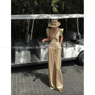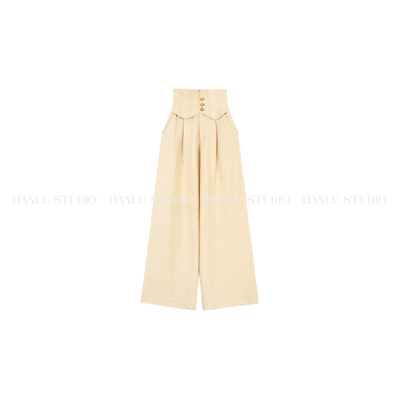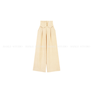 小众奶茶棕肌理料拼接腰头高腰长裤 HanLu studio时尚