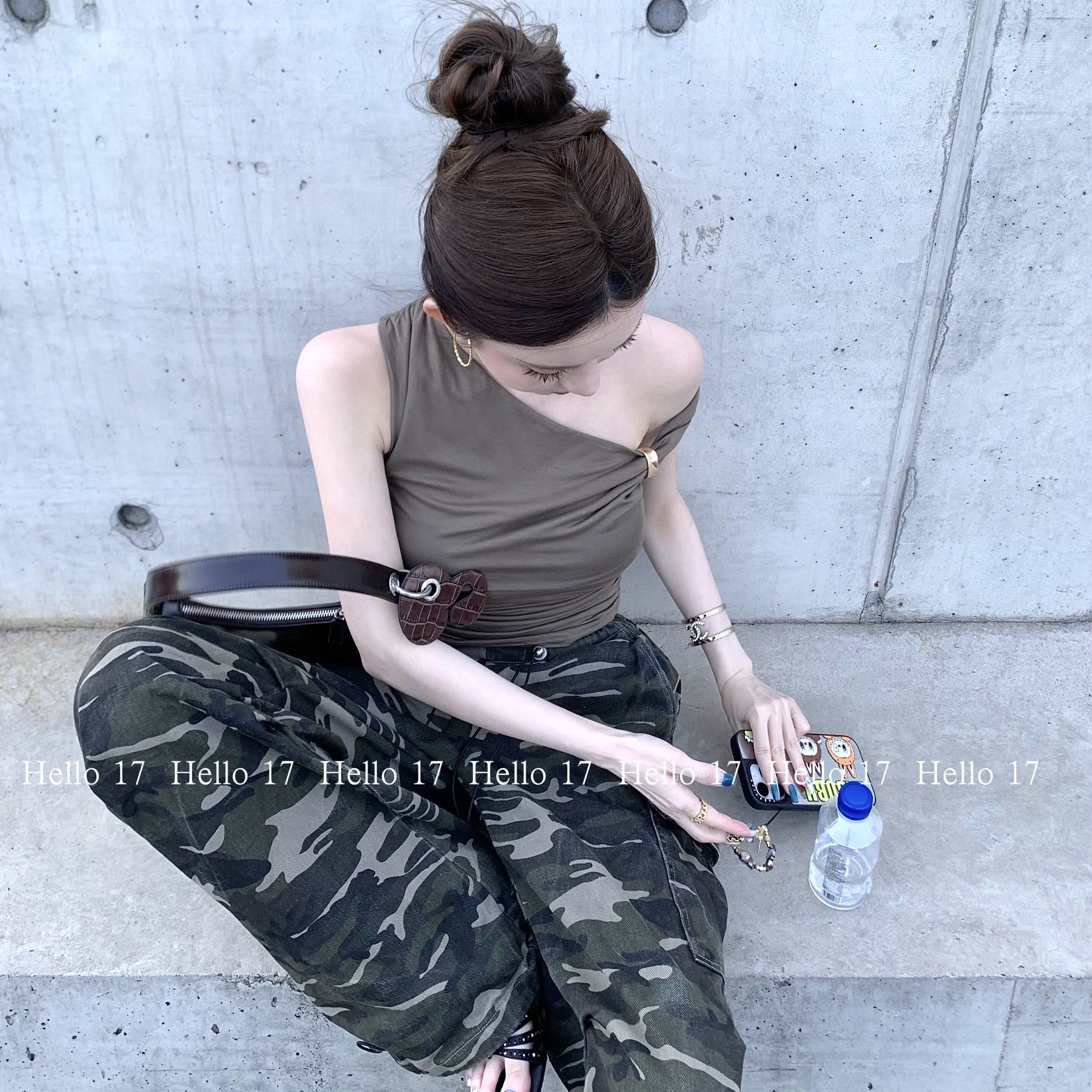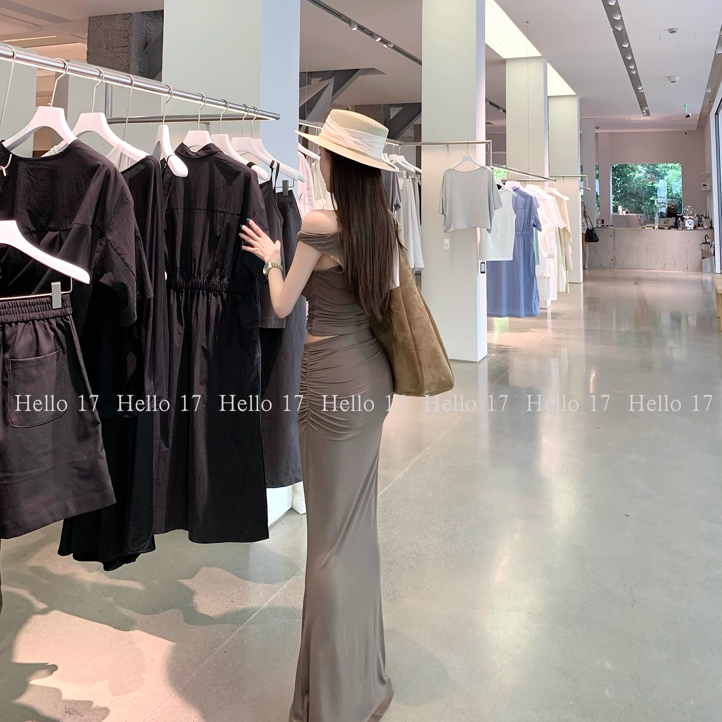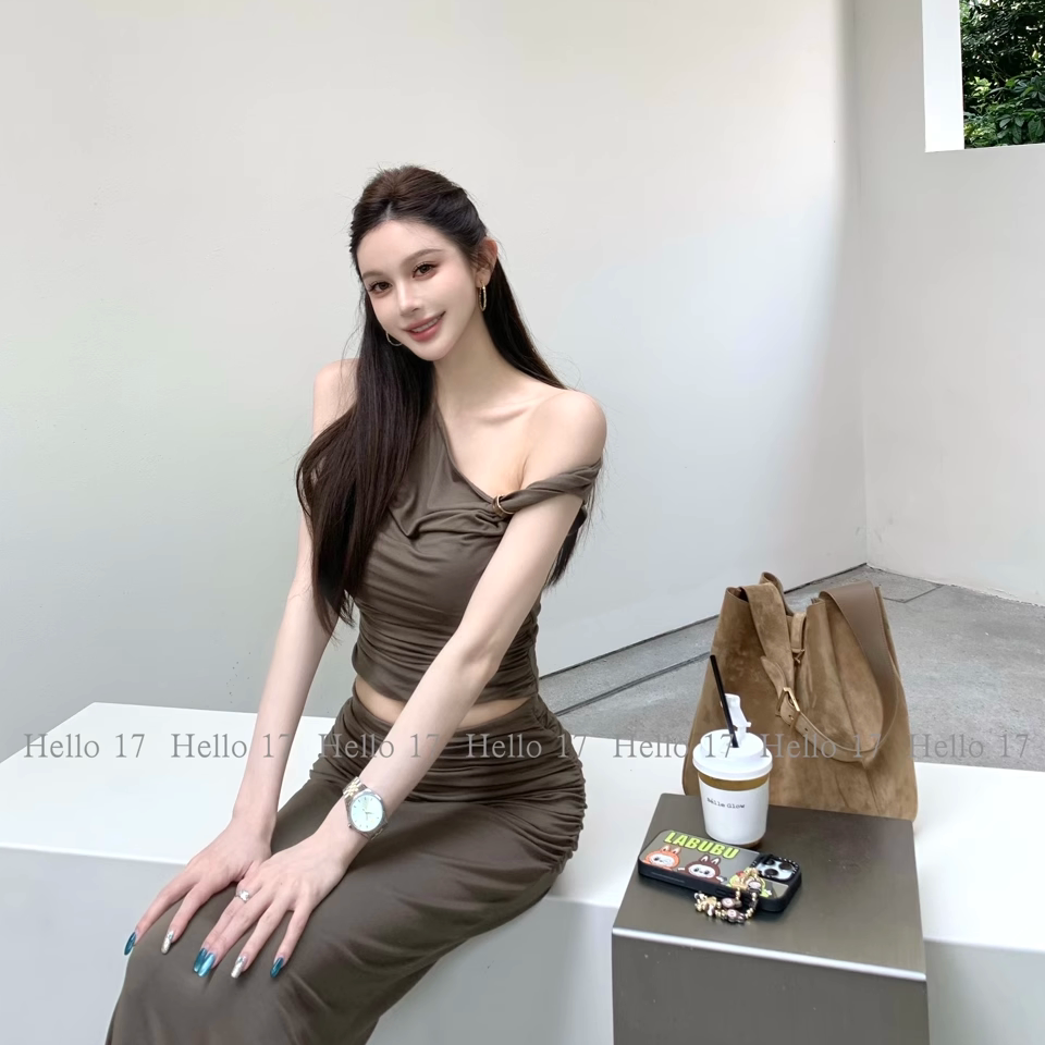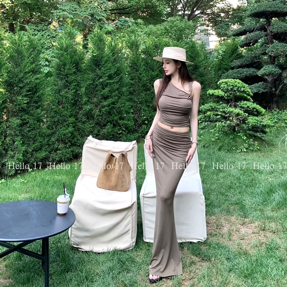 夏季 Hello 17「加州派对」不对称斜肩上衣褶皱包臀长裙套装