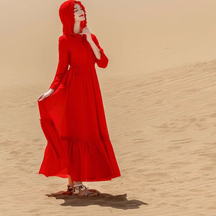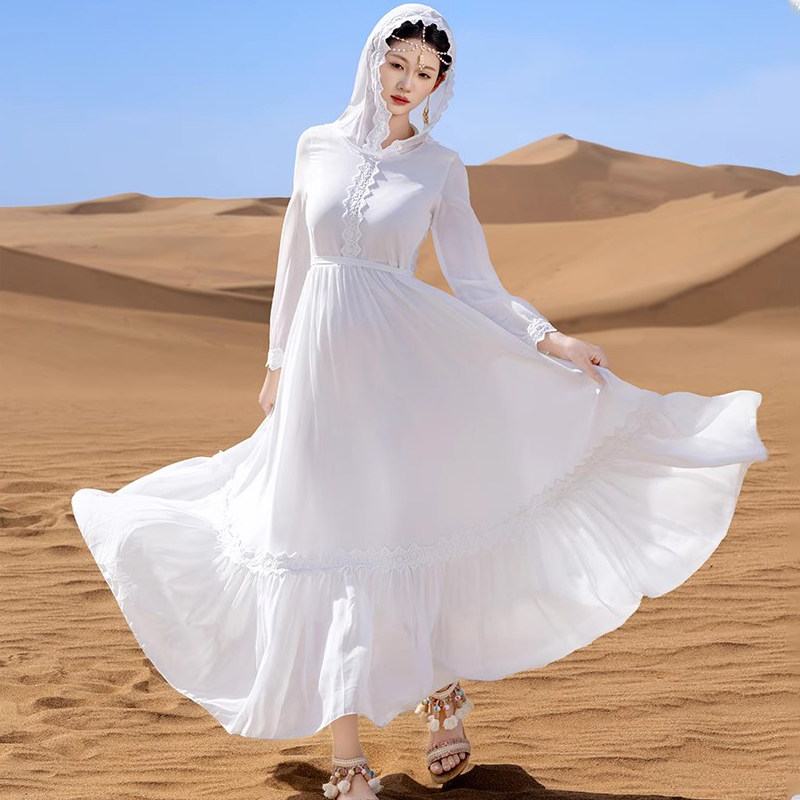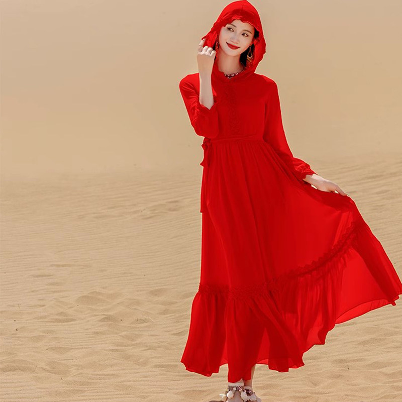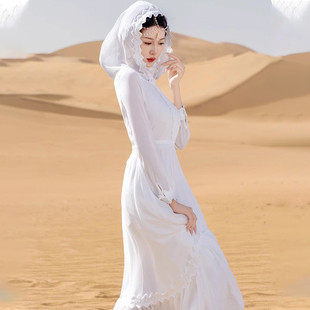 超仙沙滩沙漠旅游拍照连帽防晒真丝桑蚕丝连衣裙蕾丝拼接大摆长裙