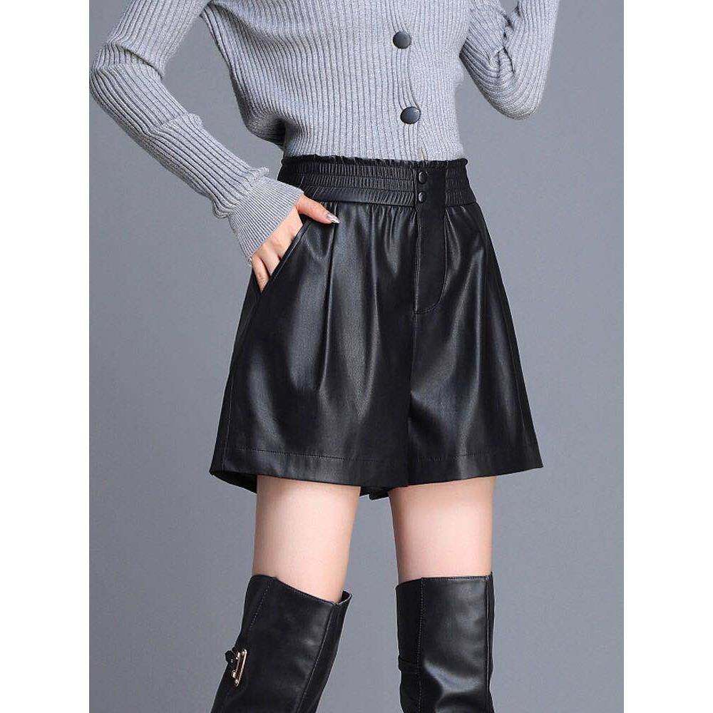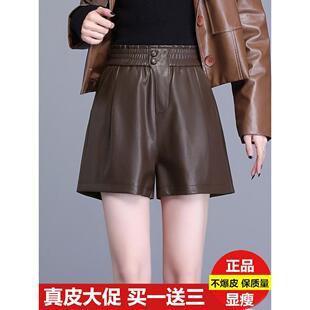 外穿a字裤 2024春秋冬新款 阔腿大码 女高腰显瘦绵羊皮短裤 真皮皮裤