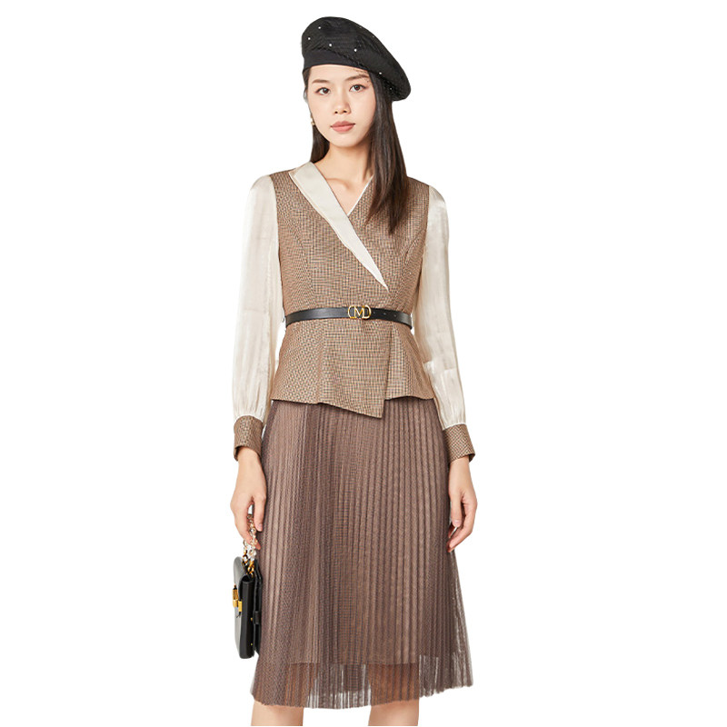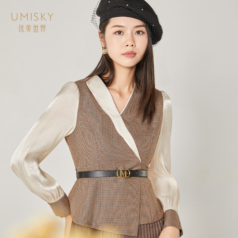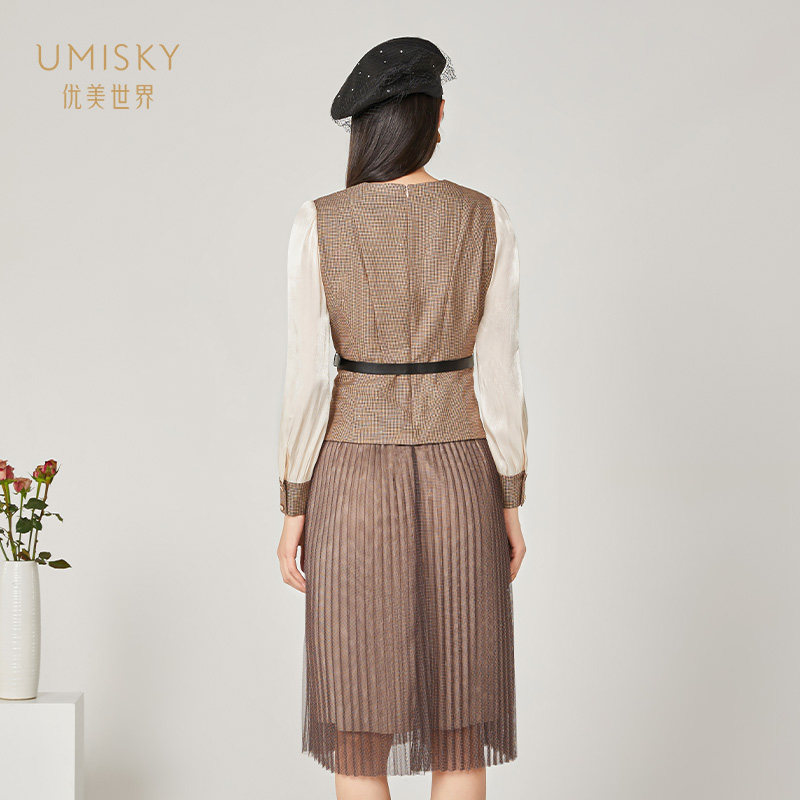 umisky优美世界商场同款 复古通勤拼接格子压褶连衣裙SI3D1040 秋季