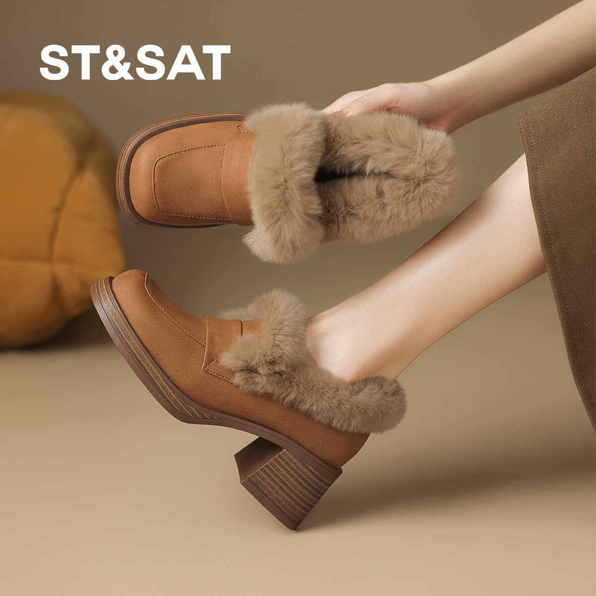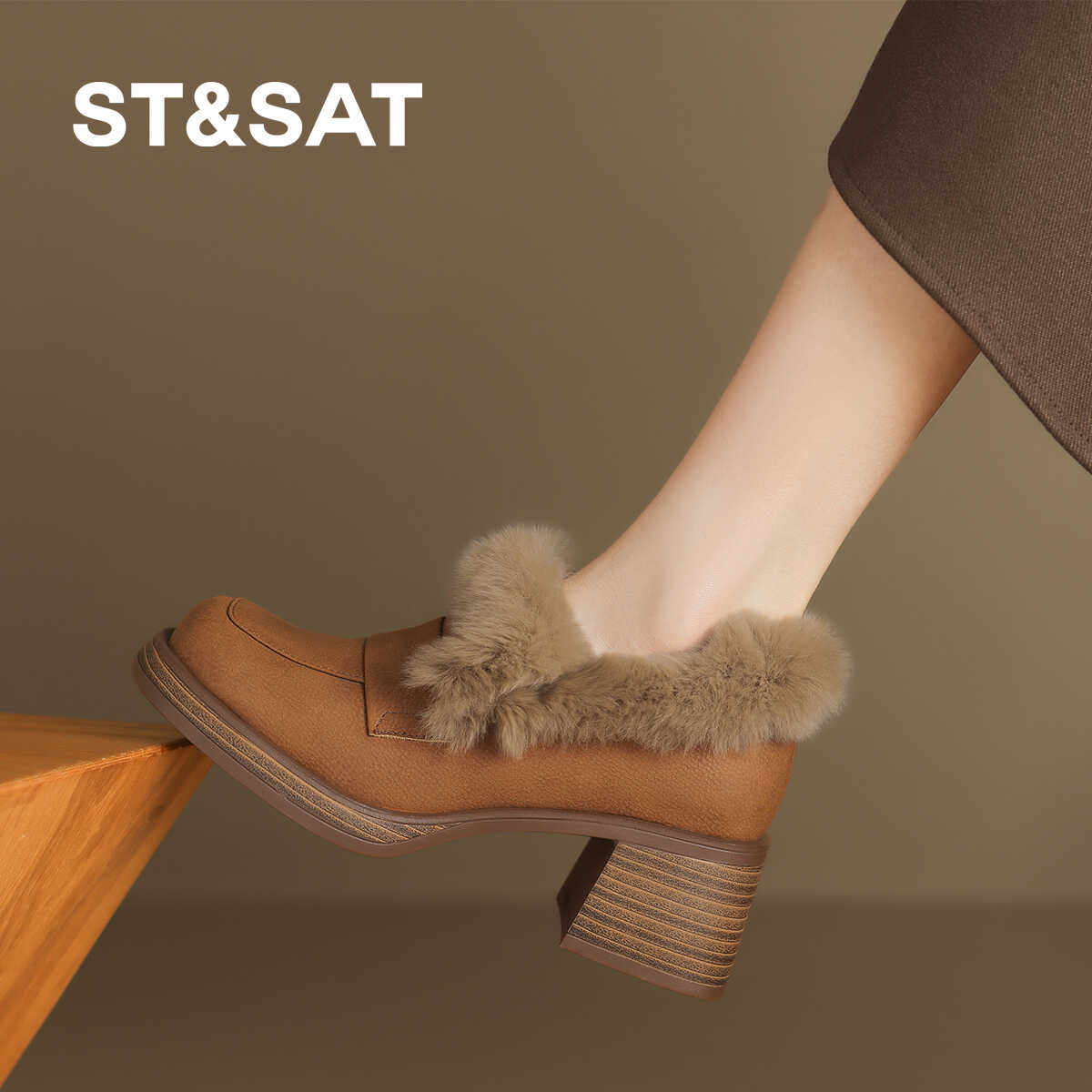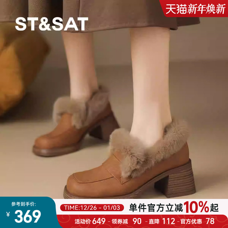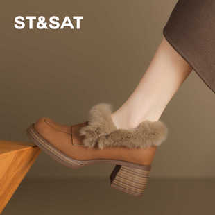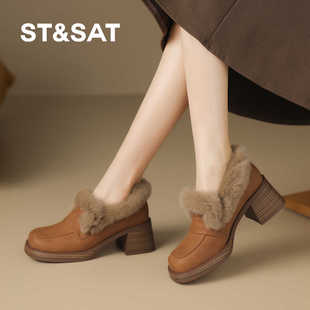 星期六2025春季 粗跟深口单鞋 新款 保暖加绒玛丽珍鞋 毛毛鞋 St&Sat