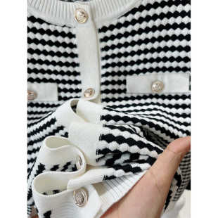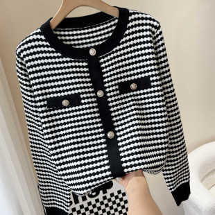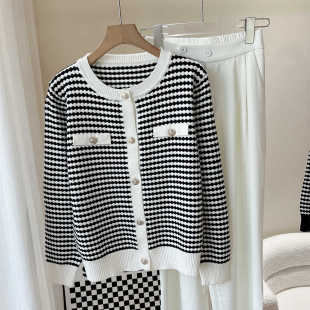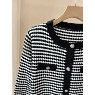 小香风撞色百搭气质大码 2025秋冬新品 开衫 针织衫 女 千鸟格圆领长袖