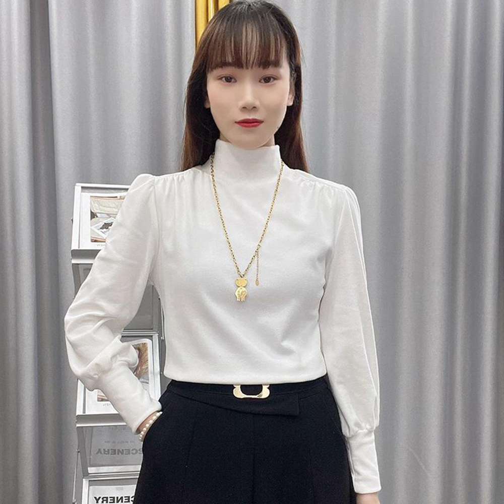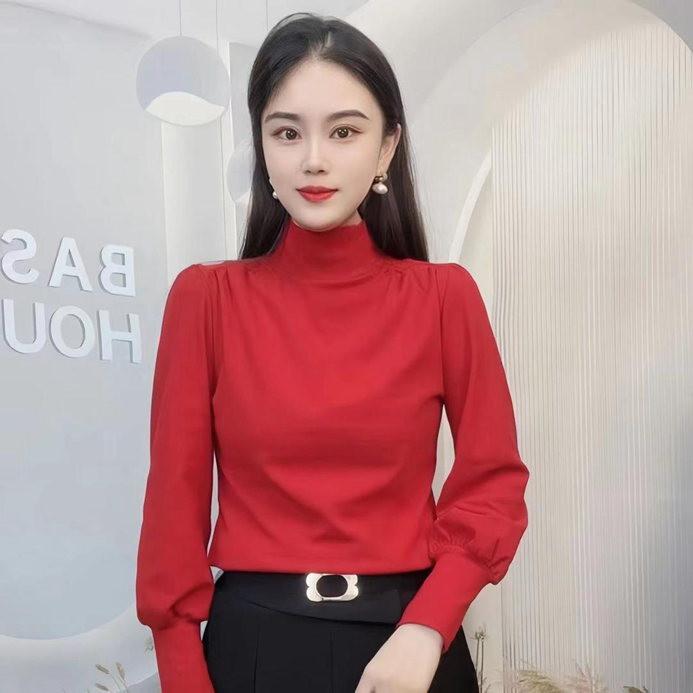 春秋气质百搭半高领上衣减龄显瘦妈妈装 纯色洋气泡泡袖 女士打底衫
