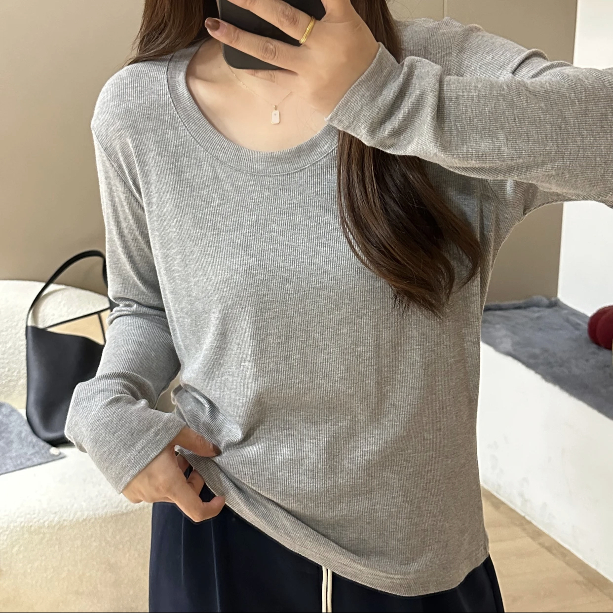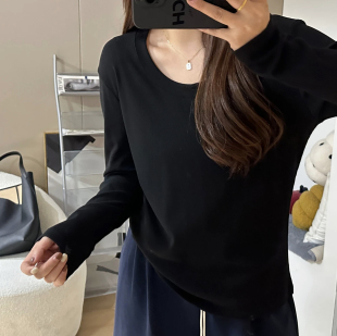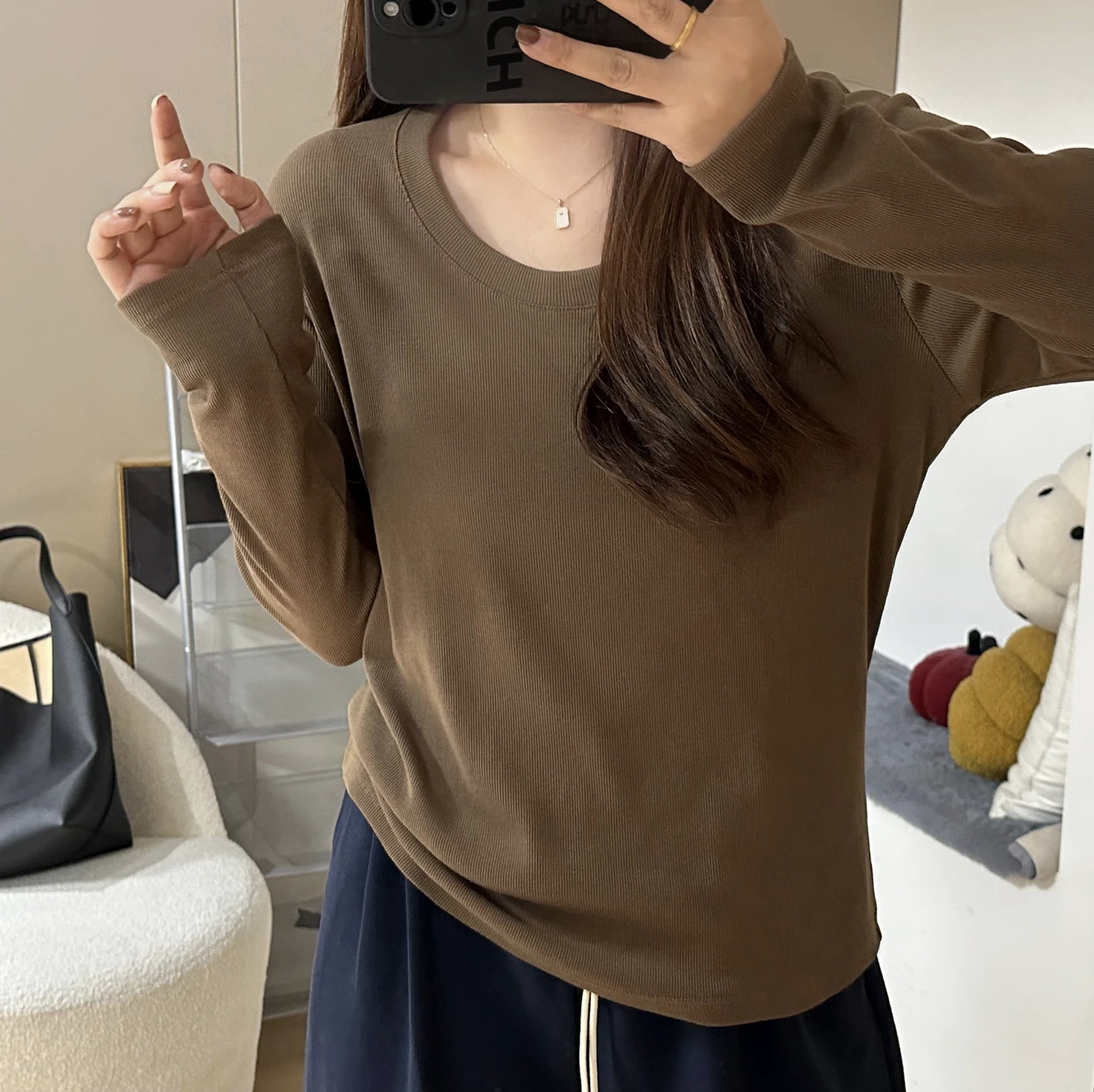 胖MM螺纹水滴圆领显瘦遮肚正肩长袖 2026春秋新款 T恤上衣 女装 大码