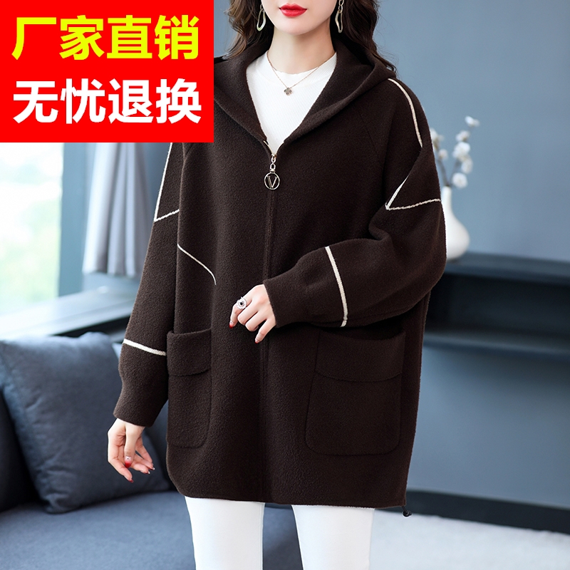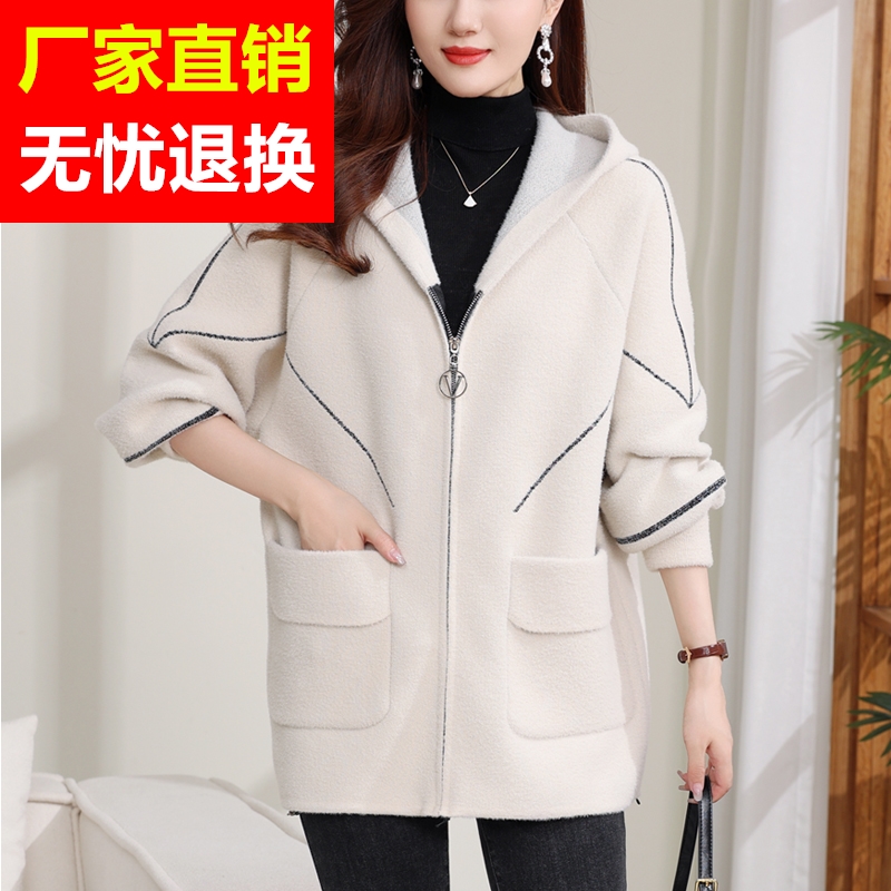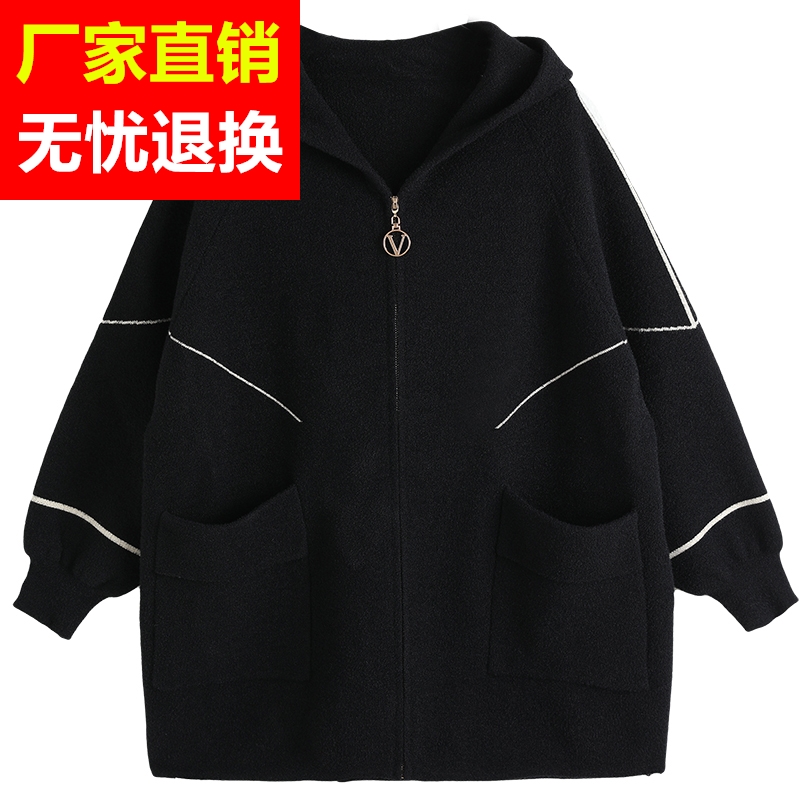 毛呢外套 秋冬加肥加大码 连帽双面羊绒大衣女中长款 胖妈妈宽松开衫