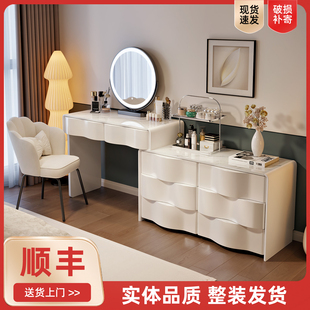 带灯实木梳妆台卧室现代简约小型奶油风化妆桌床头收纳柜一体白色