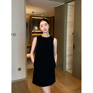 Maven Lin知性通勤奢华钉钻背心连衣裙女黑色圆领气质a字直筒短裙