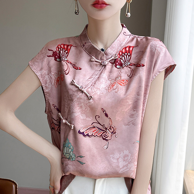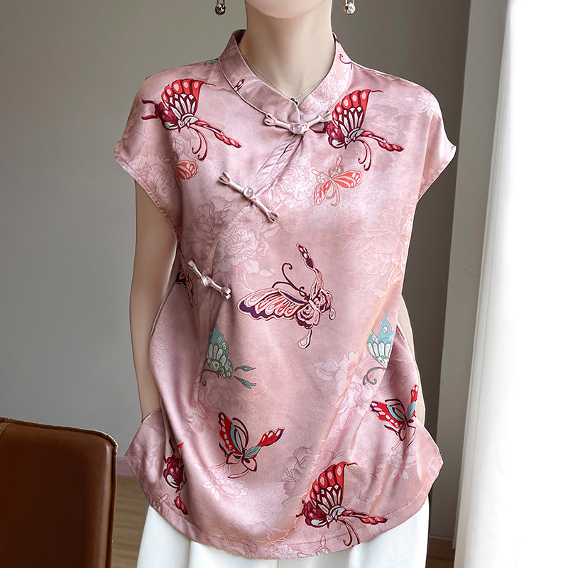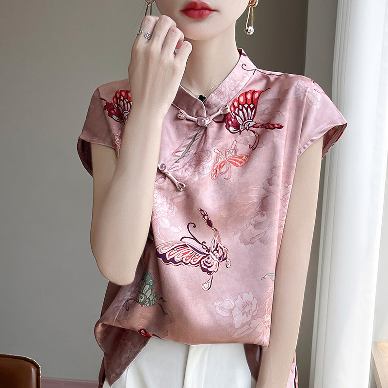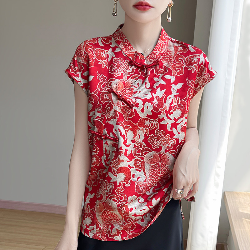 夏季 立领盘扣衬衫 新款 改良旗袍小衫 女士 中式 红色国风真丝上衣短袖