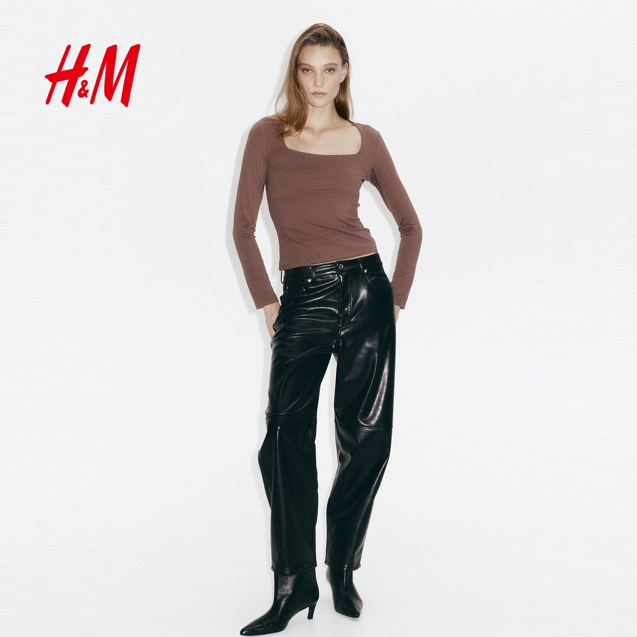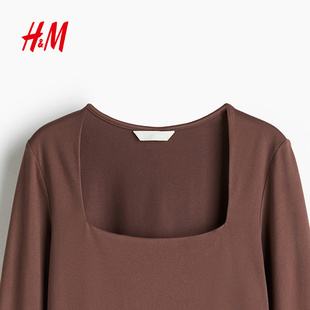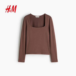 修身 HM女装 简约通勤方领打底长袖 新款 上衣1089811 T恤2025年冬季