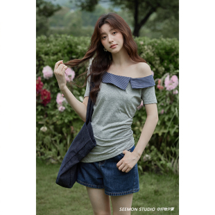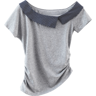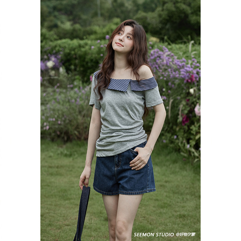 t恤 夏韩系露肩气质上衣设计感小众斜肩格子拼接短袖 清仓秒杀