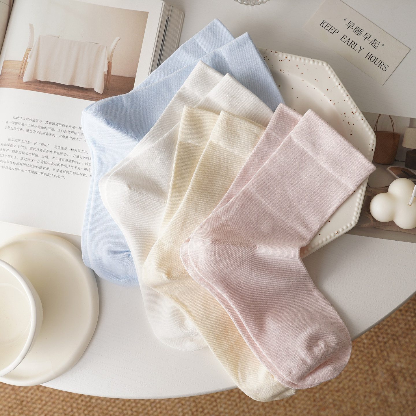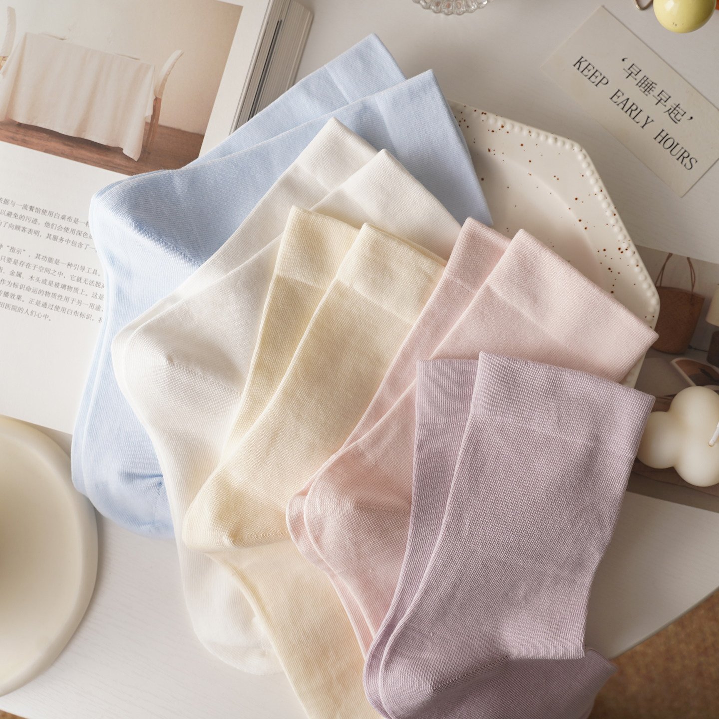 纯棉抗起球 莫兰迪配色松口袜子女中筒春夏百搭纯色堆堆 无骨缝头