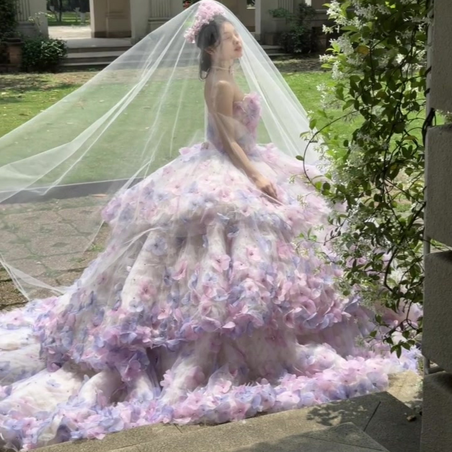 新娘结婚晨袍高级小众铃兰花超仙法式 吊带旅拍轻婚纱小拖尾出门纱