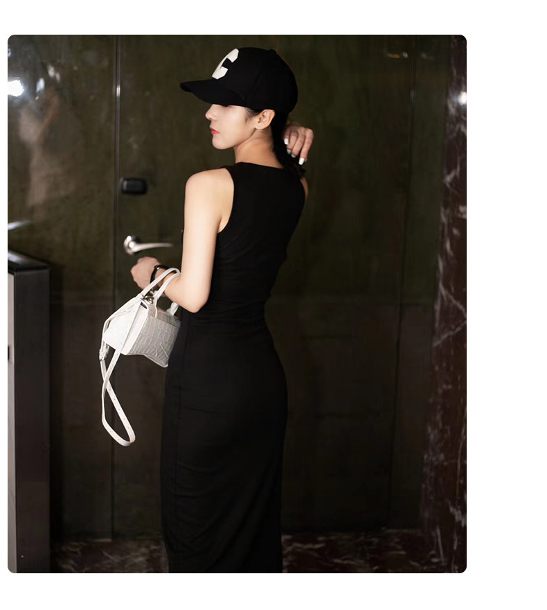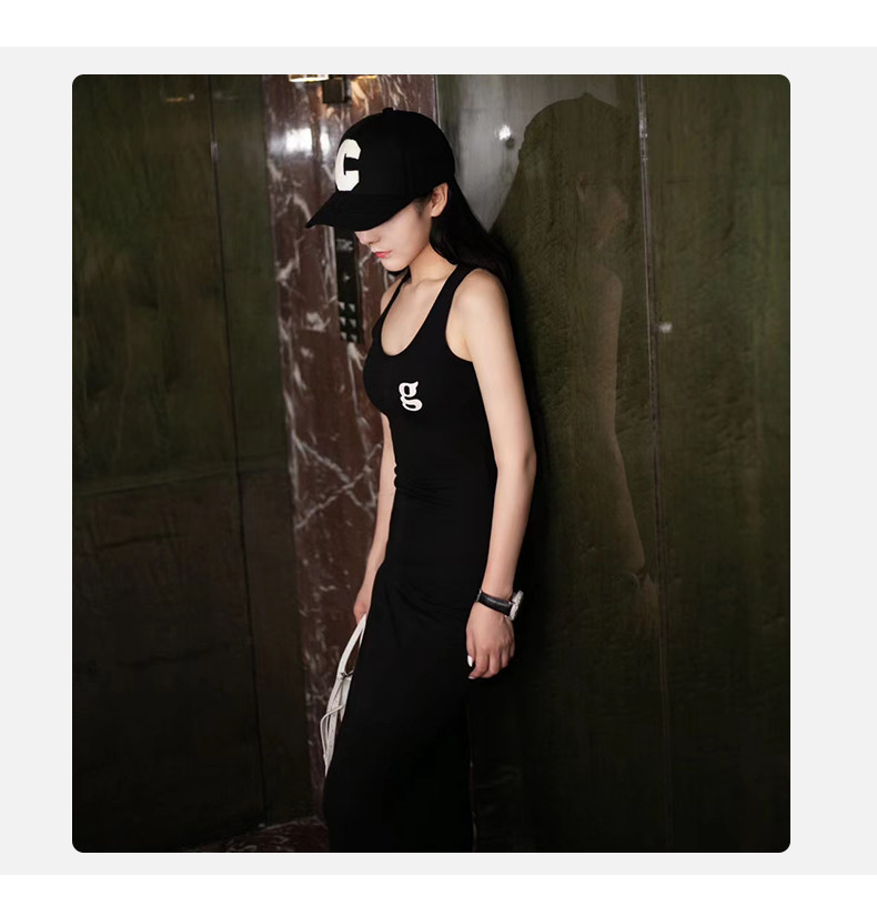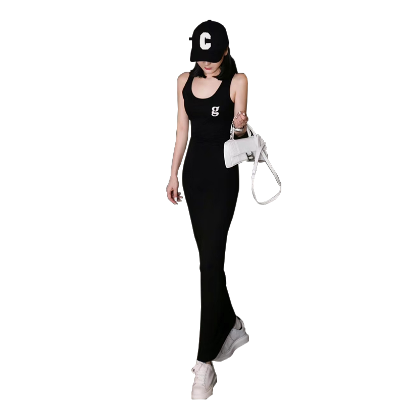 t恤连衣裙 高腰长裙显瘦无袖 2025春夏黑色印花背心吊带裙韩版 修身
