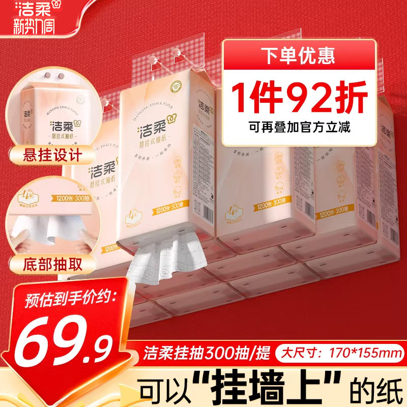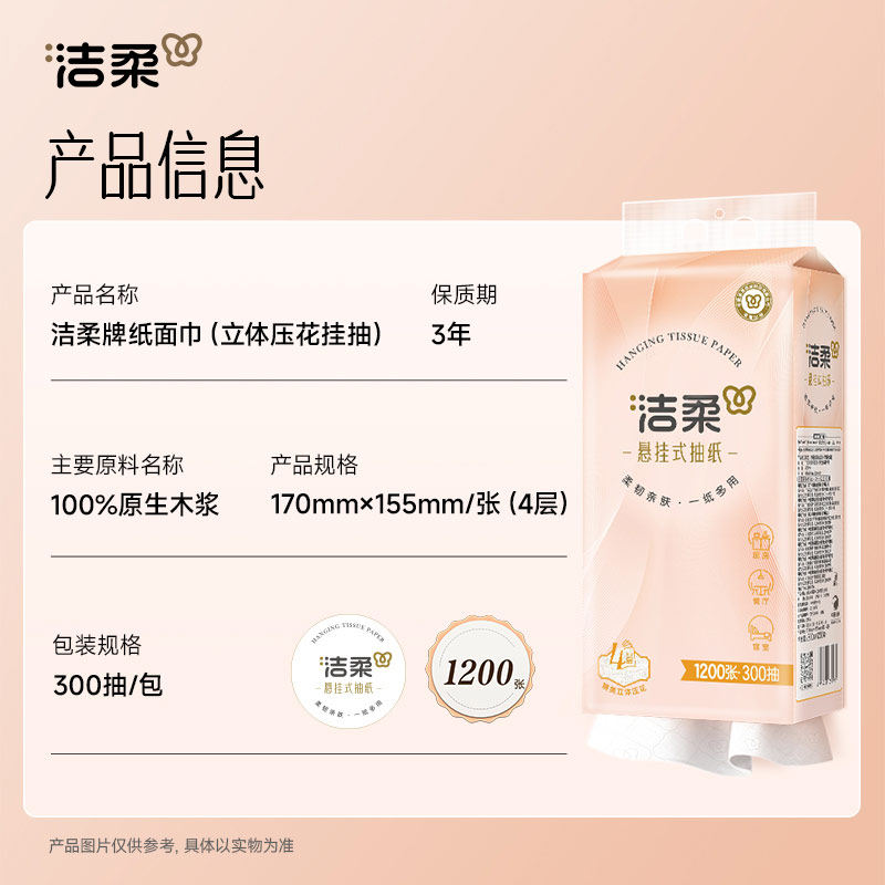 洁柔悬挂式 便利抽纸12提共3600抽4层加厚立体压花挂抽纸巾