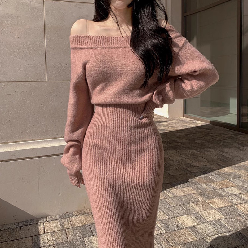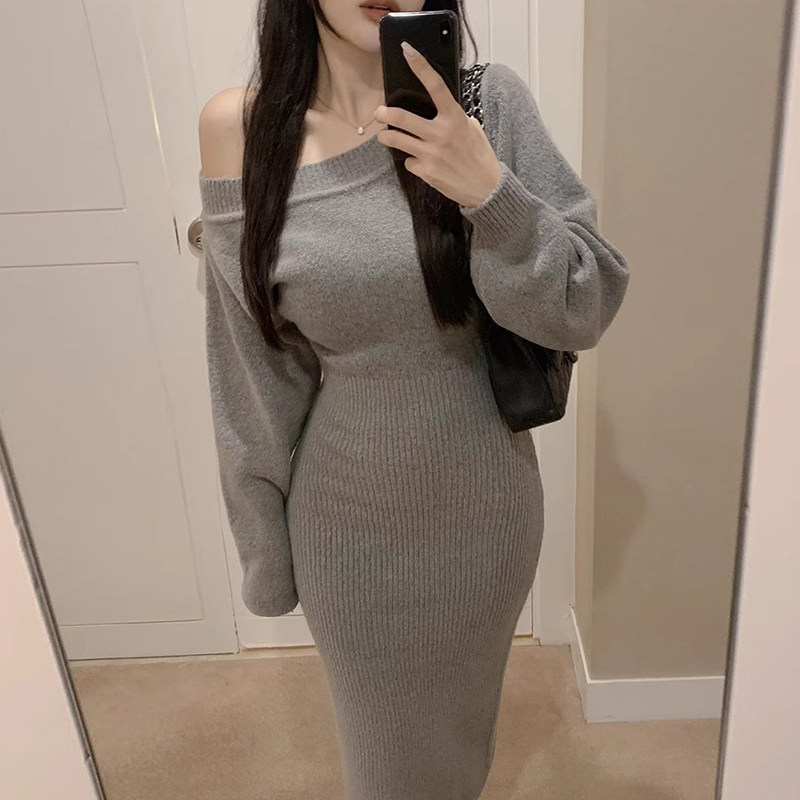 显瘦纯色针织包臀裙连衣裙女 纯欲风斜领露肩修身 韩国chic秋季 法式