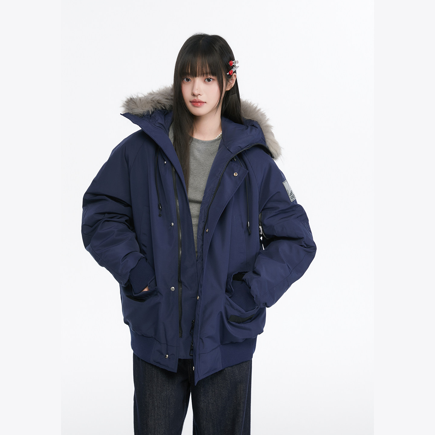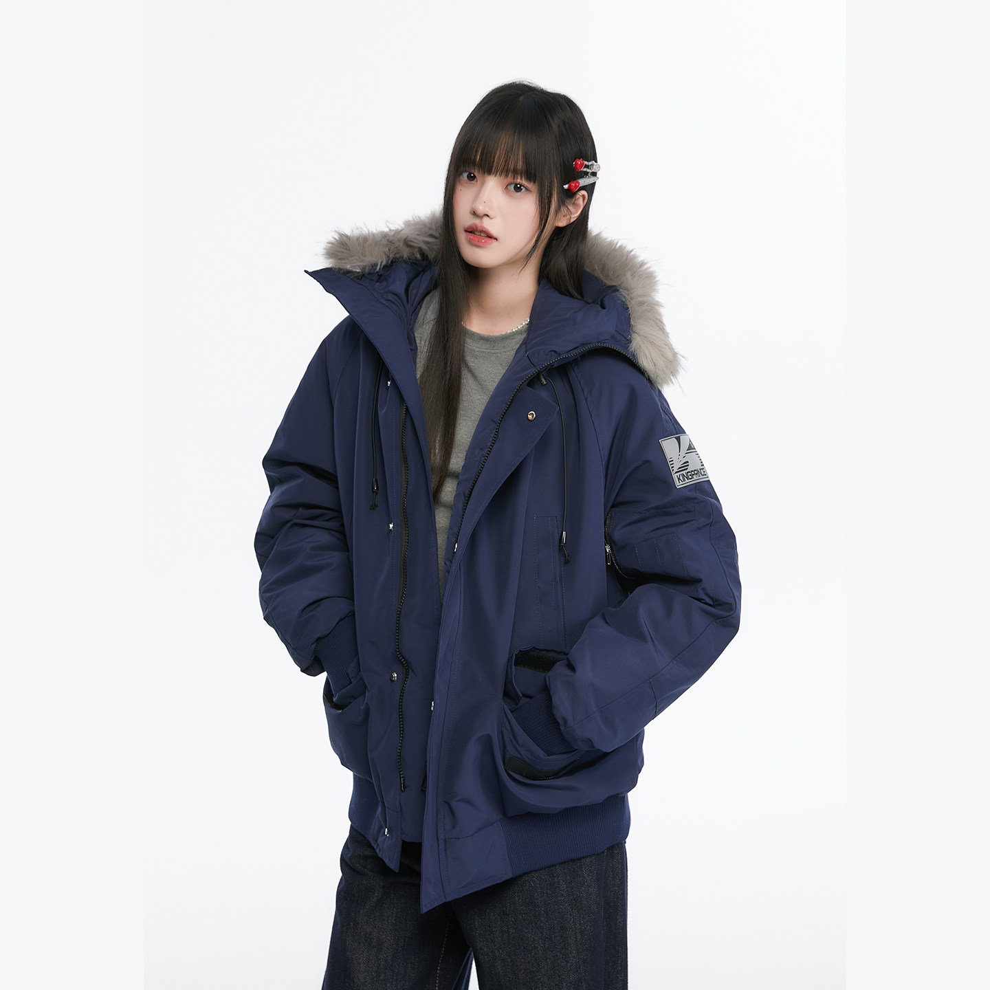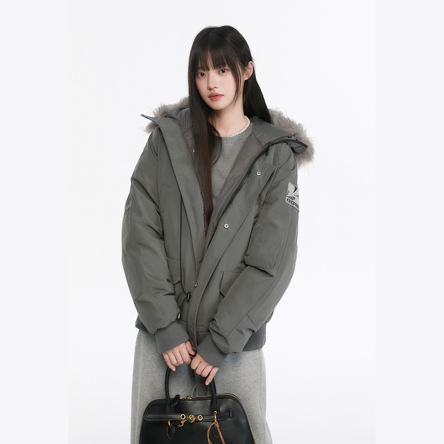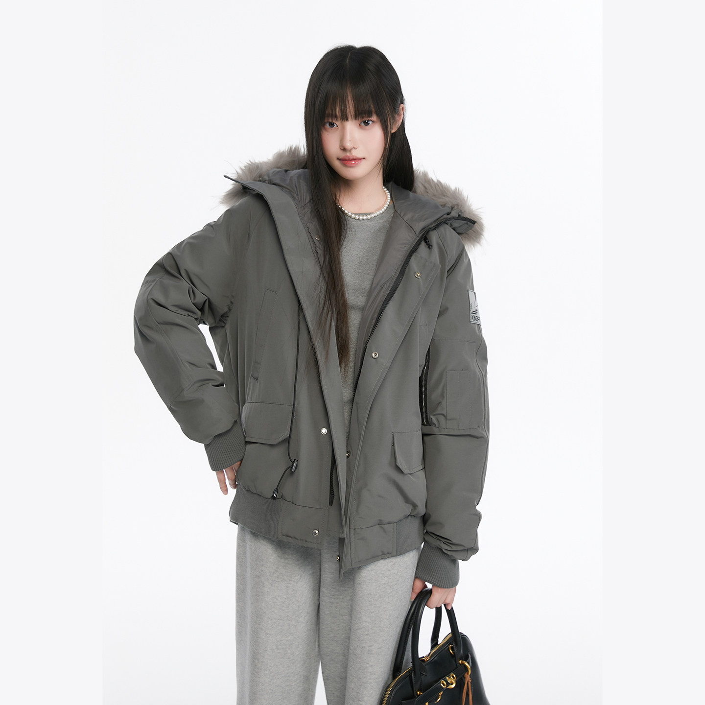 加厚保暖棉衣外套女 复古灰色派克服毛领棉服冬季 King Prince美式