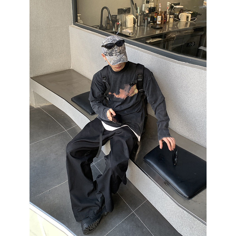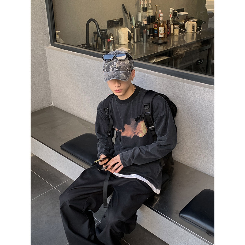 打底衫 直喷原创印花火焰印花宽松休闲百搭长袖 水洗做旧数码 PLTH