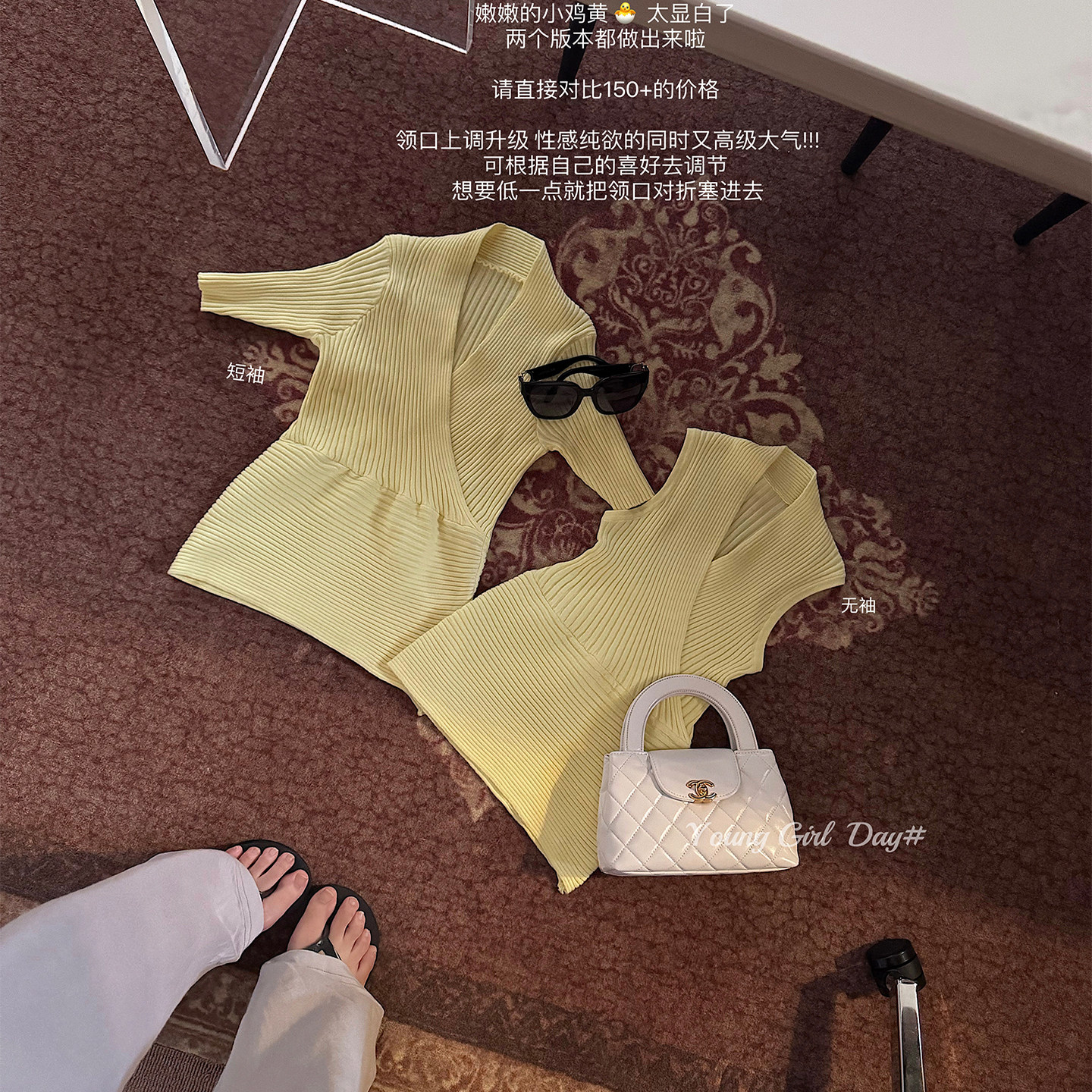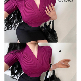 YoungGirlDay纯欲风辣妹性感交叉V领修身 针织T恤上衣 收腰显瘦短袖