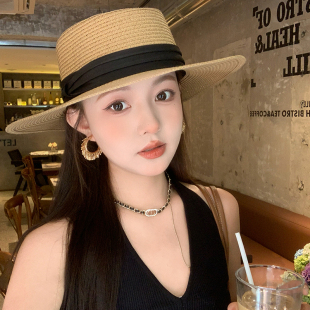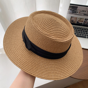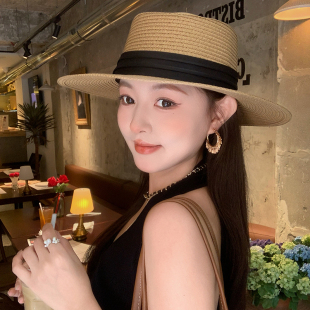 法式 平檐防紫外线海边度假遮阳防晒太阳帽子 赫本风平顶草帽女夏季