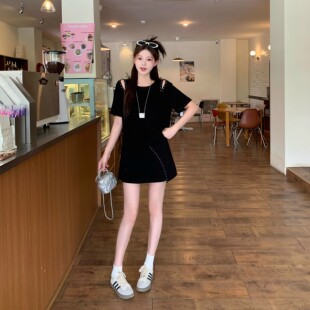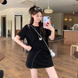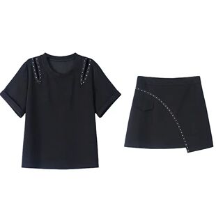 休闲套装 钉珠短裙大码 女2025新款 短袖 减龄两件套 夏季 胖MM显瘦韩版