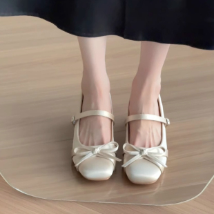 高跟芭蕾鞋 粗跟单鞋 法式 内增高7cm绸缎面蝴蝶结玛丽珍女2026新款