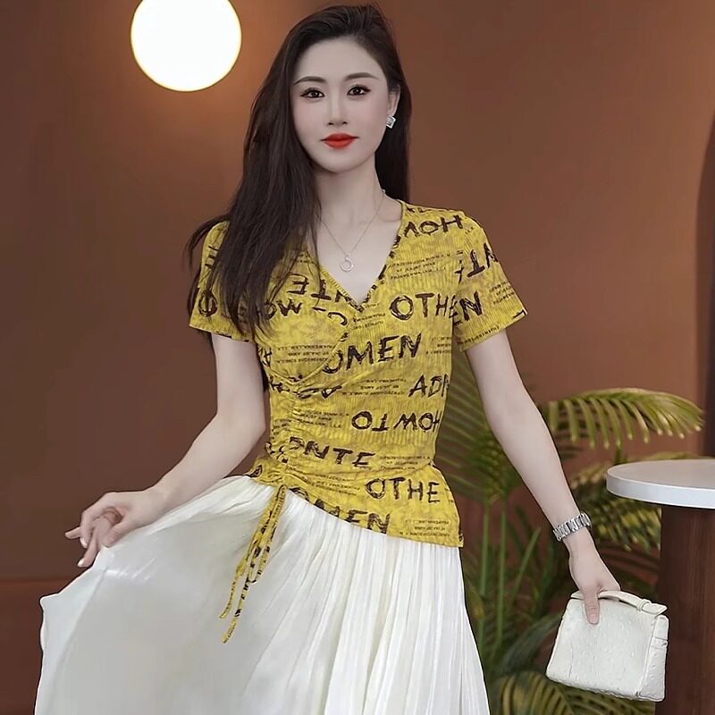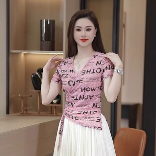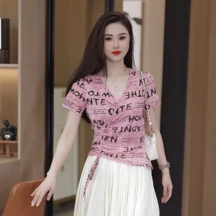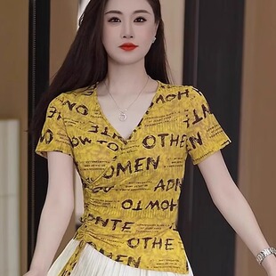 女夏季 上衣宽松减龄女士 字母印花t恤显瘦百搭Q2025年圆领套头短袖