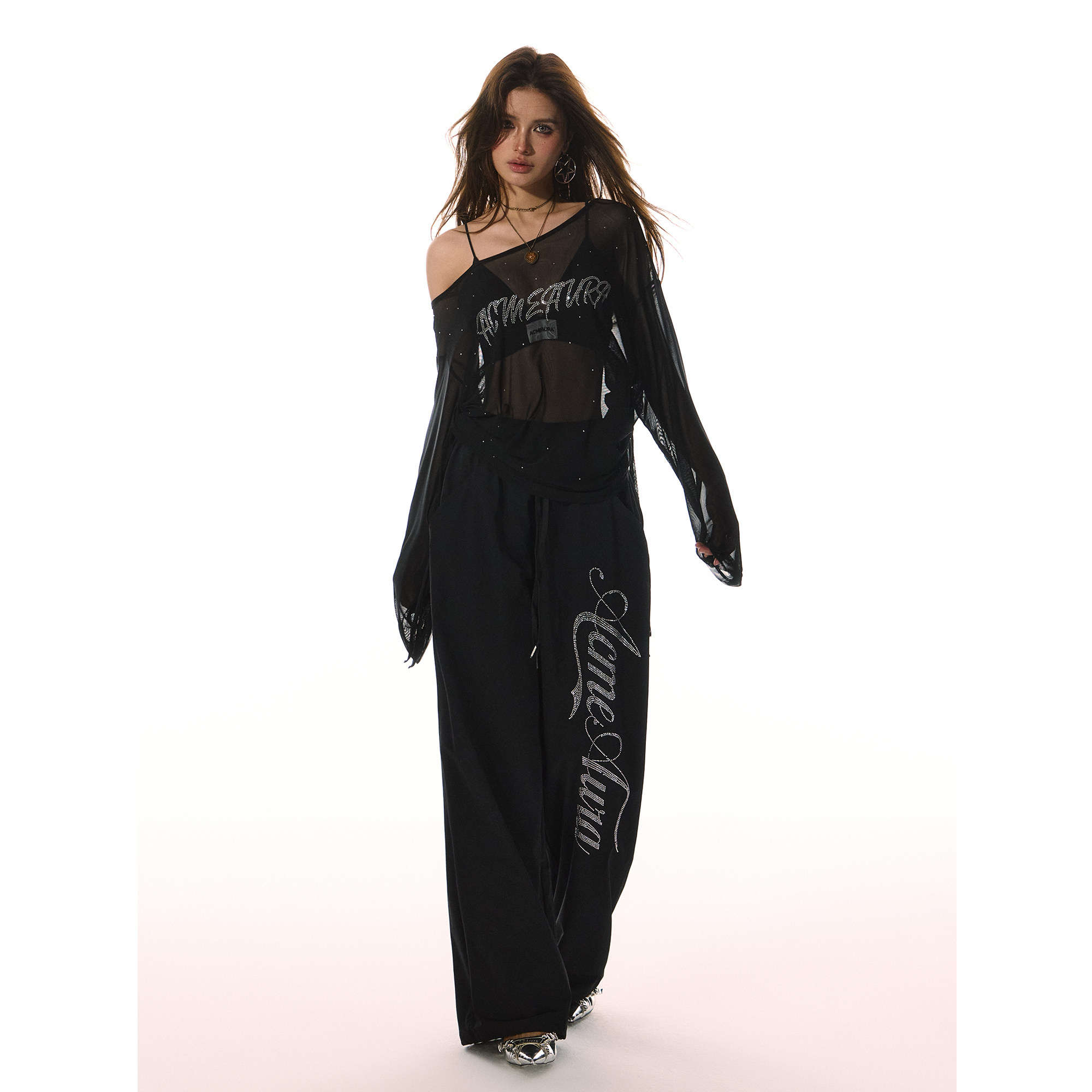 罩衫 ACMEAURA 辣妹hiphop街舞穿搭网纱衣服黑色网纱上衣黑色长袖