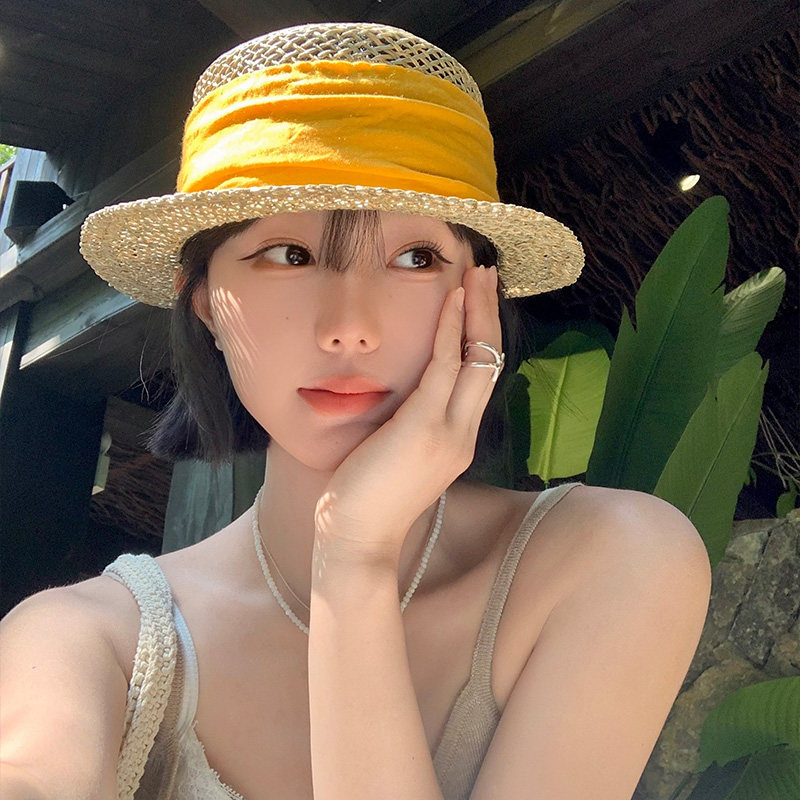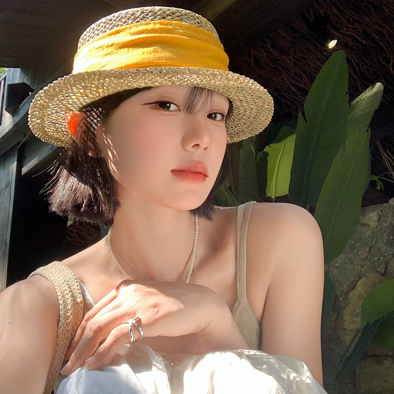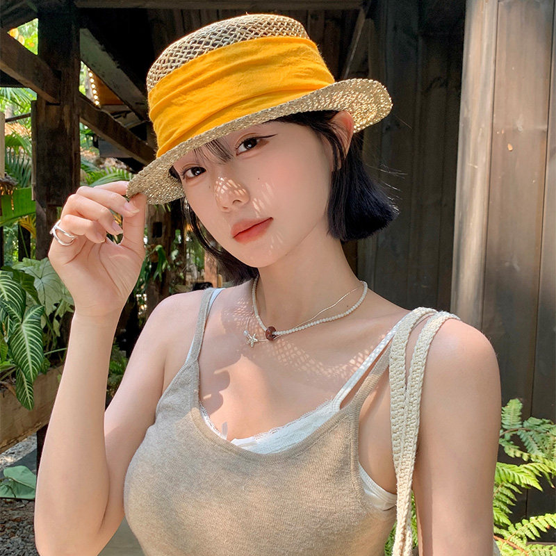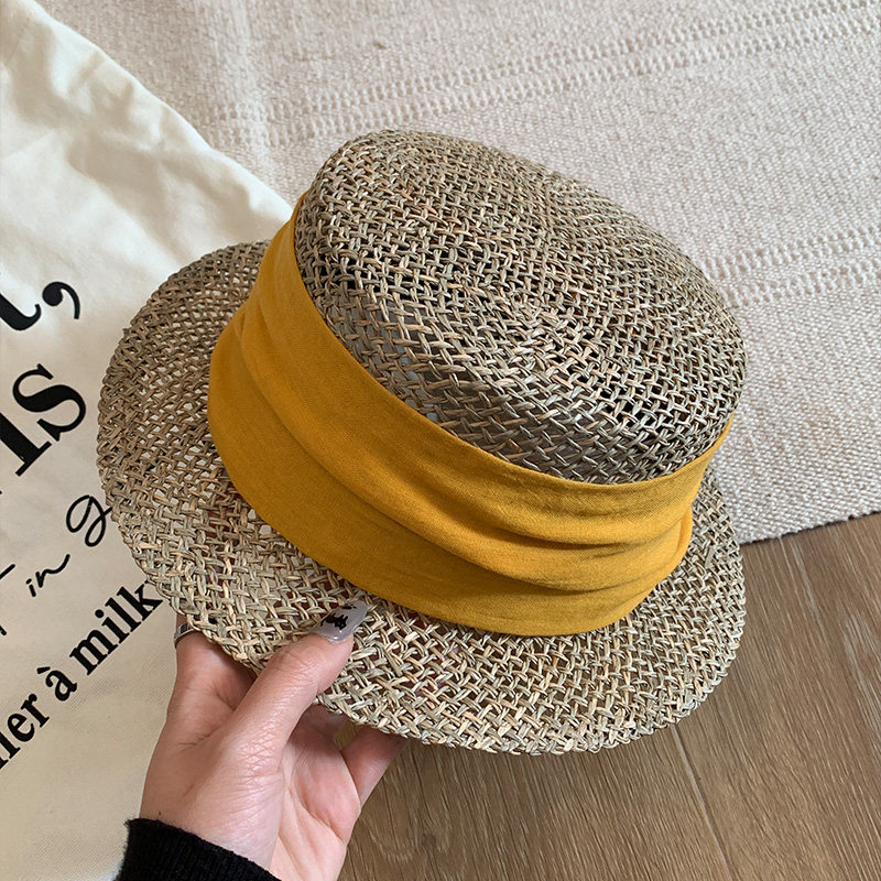 老钱风复古咸草平顶草帽女夏草编礼帽海边度假沙滩帽遮阳防晒帽子