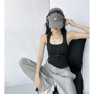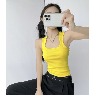 美式 方领宽肩带运动背心女夏外穿紧身高腰露脐辣妹内搭工字上衣