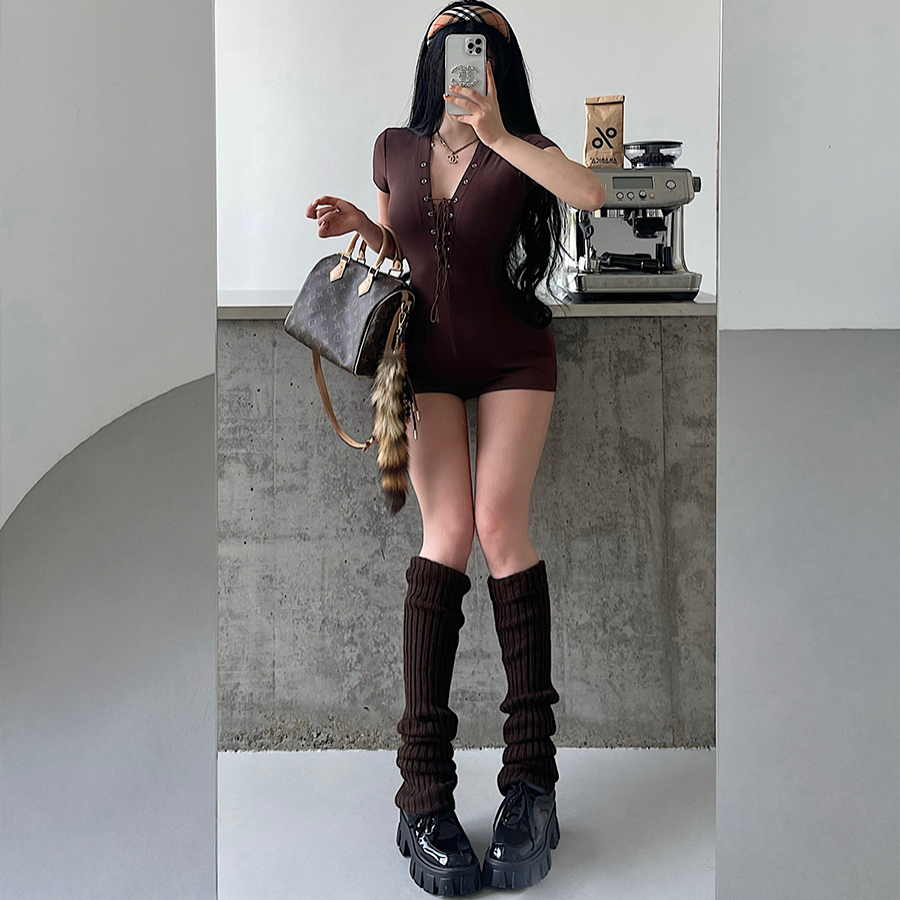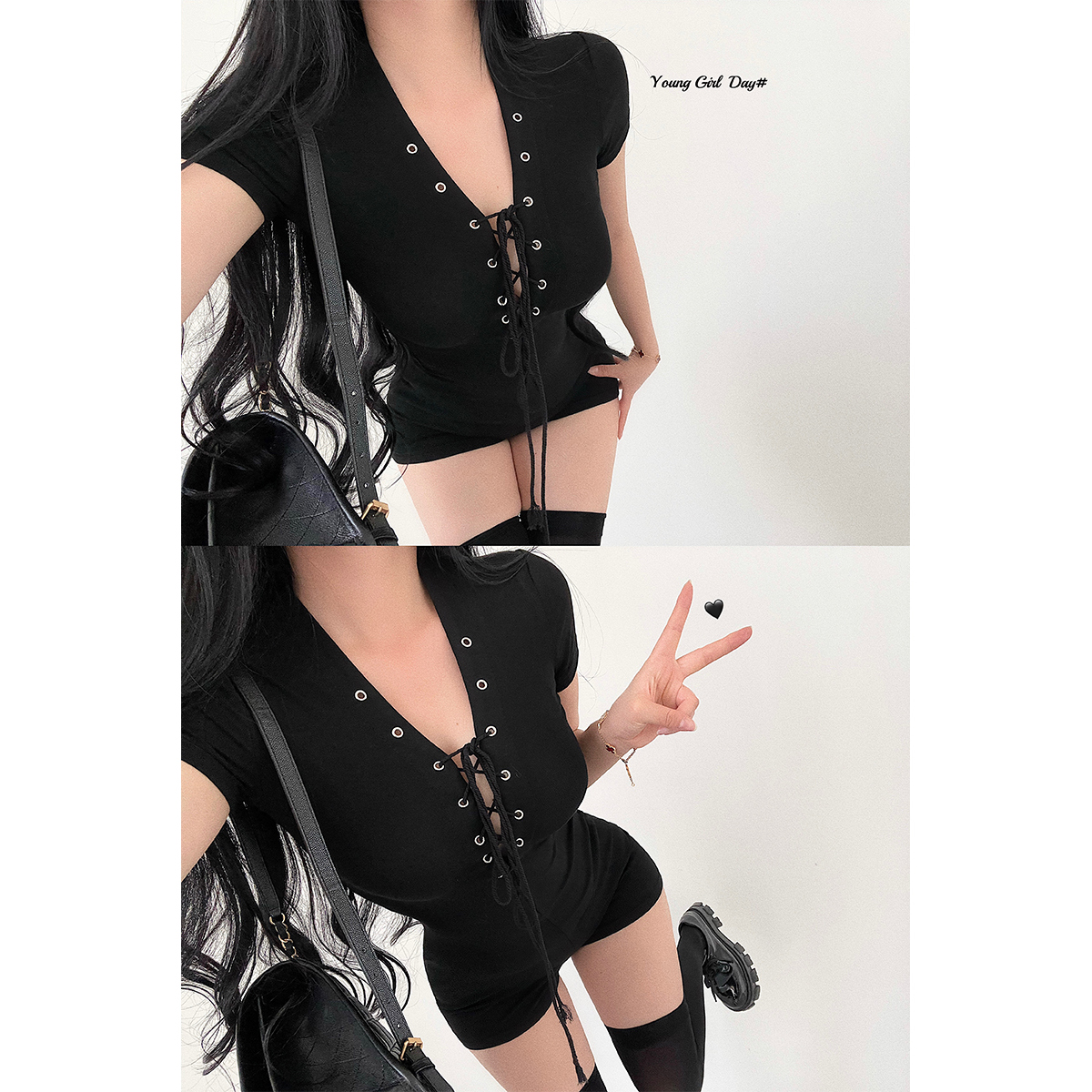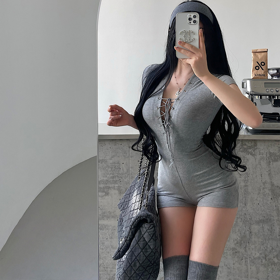 连体衣短裤 辣妹性感深V领交叉绑带紧身显瘦短袖 美式 YoungGirlDay